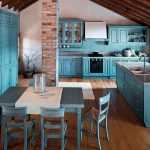 - Țară. În acest caz, se recomandă culori mai strălucitoare de azur, care sunt utilizate pentru finisarea șorțului, precum și alte suprafețe. Este bine să combinați alb și verde și chiar nuanțe alb-negru într-un astfel de interior.