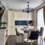 - Spatele și blatul din bucătărie sunt realizate în culori opuse nuanței mobilierului de bucătărie și grupului de mese. Cu ajutorul detaliilor contrastante, puteți plasa corect accentele în cameră.