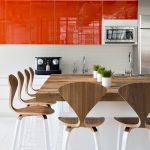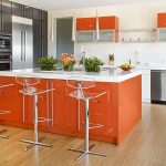 Portocaliul este considerat o culoare suculentă care ajută la trezirea poftei de mâncare. Este deosebit de important să faci o astfel de bucătărie pentru familiile cu copii mici. În interior, este adecvat să folosiți toate nuanțele de portocaliu care amintesc de vara caldă: portocaliu, chihlimbar, piersică. Portocaliul este o opțiune versatilă, deoarece se potrivește bine în interiorul bucătăriilor mici și mari.