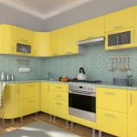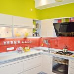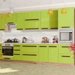 Ca rezultat al combinării galbenului și verde, puteți obține un interior de bucătărie foarte atractiv și confortabil. Această combinație de culori a fost utilizată cu succes în proiectarea atât a bucătăriilor drepte, cât și a colțurilor. Trebuie remarcat faptul că aproape întreaga paletă de nuanțe de verde este în armonie perfectă cu galbenul, cu excepția tonurilor de verde mlaștină. Prezența chiar și a două nuanțe de verde este acceptabilă, de exemplu, o combinație de verde deschis cu verde bogat și galben deschis.