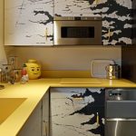 - În timp ce galbenul este unul dintre cele mai deschise tonuri, este considerat practic. Datorită acestei proprietăți, este recomandat pentru decorarea suprafeței de lucru a blatului și a șorțului, ceea ce va ajuta la o bucătărie mică puțin mai mare.