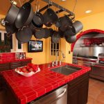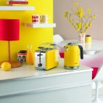 Culoarea roșie va da interiorului galben o notă de est. Cu toate acestea, alegerea nuanțelor de stacojiu trebuie să fie foarte atentă.Cel mai bine este dacă sunt câteva elemente luminoase care ies în evidență pe fundalul unui galben mai calm. Aceste articole vor atrage în primul rând atenția celor care vin în bucătărie.