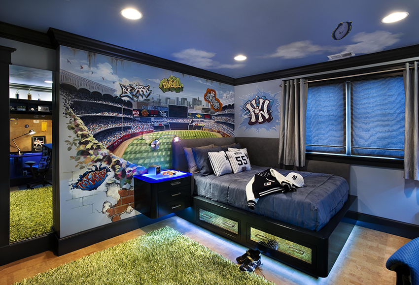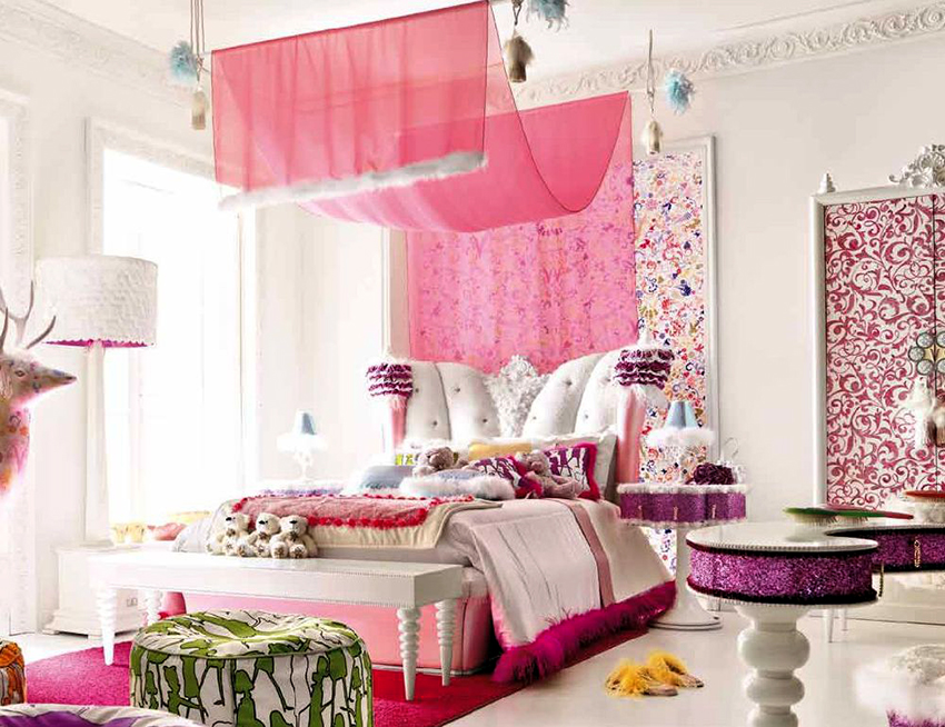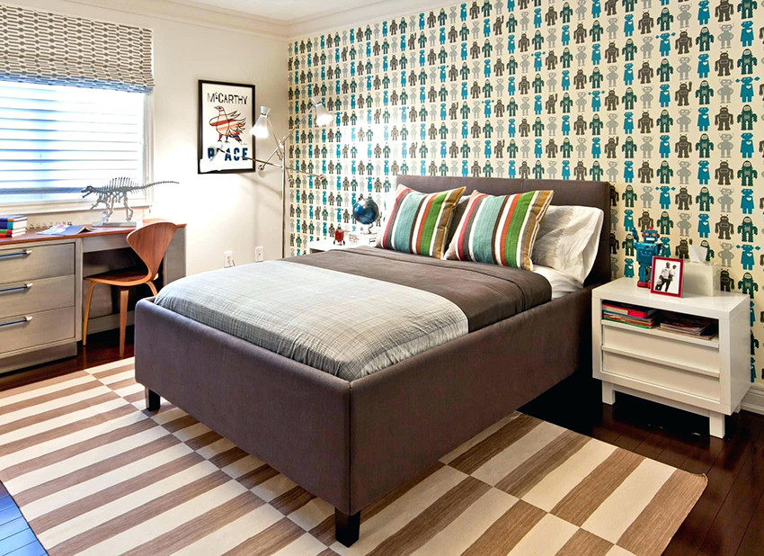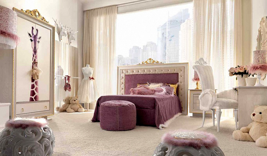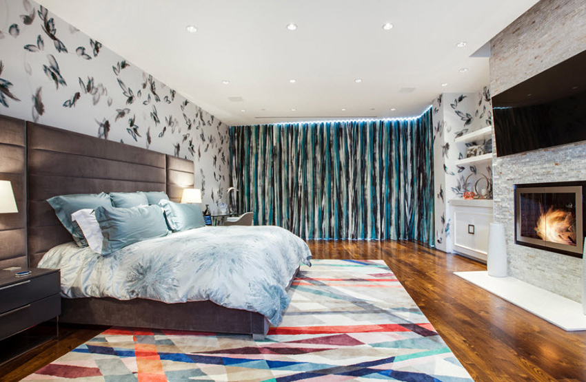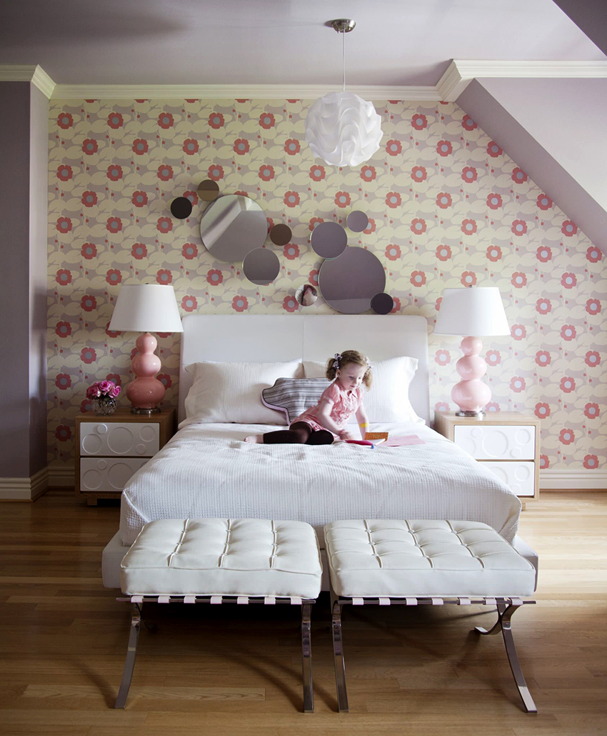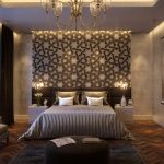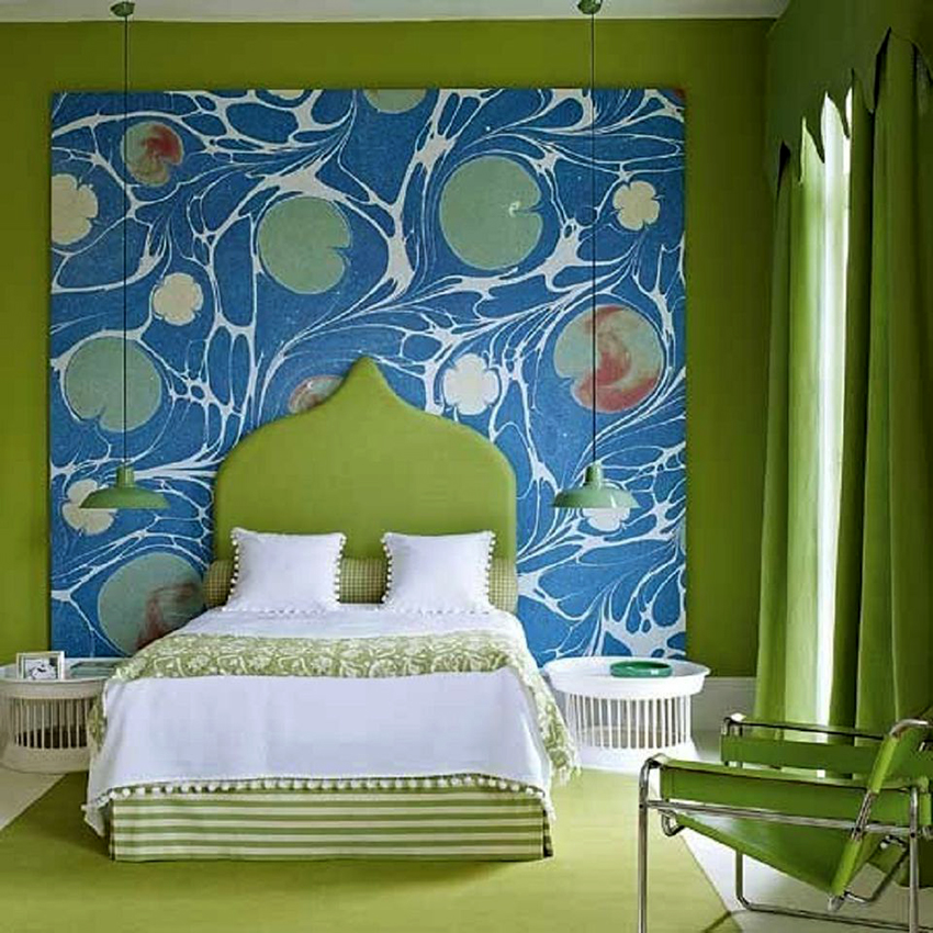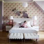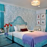 Un model decorativ pe perete (de la pat până la tavan), de exemplu, ramuri de sakura înflorită în stil oriental, o perdea rococo franceză care cade sau un baldachin baroc, nu va arăta mai puțin frumos.