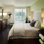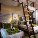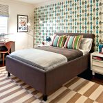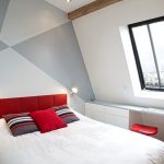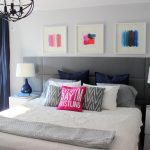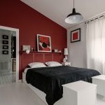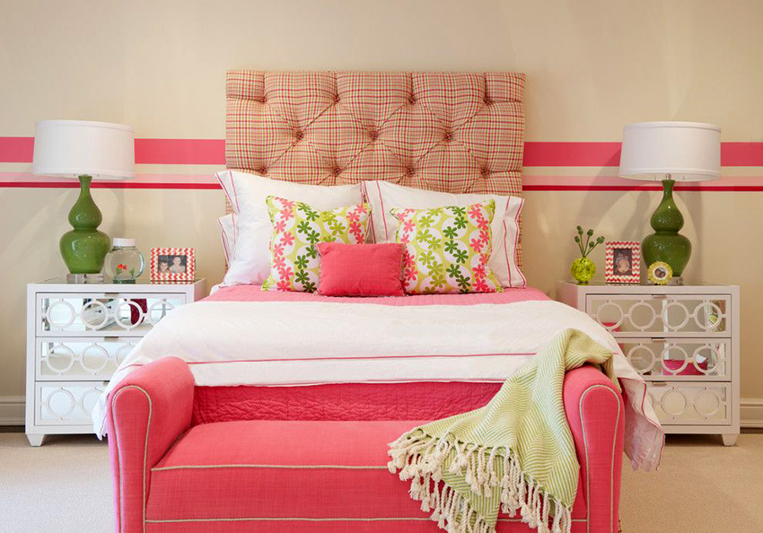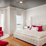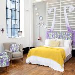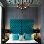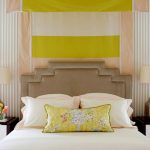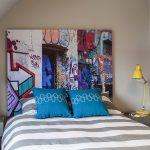 Un loc special în diversitatea speciilor de tăblii este ocupat de un spate înalt, care vă permite vizual să măriți înălțimea tavanului. În același timp, nu este deloc necesar să coaseți un fundal din țesătură sau să-l faceți din lemn, este suficient doar să pictați peretele din spatele patului într-o altă culoare. Tabla cu dungi verticale care ajunge la tavan va arăta originală. Culorile strălucitoare vor ajuta la „aruncarea în aer” a unui interior plictisitor. Pentru a face dungile uniforme, merită să desenați o schiță cu un creion și să aplicați vopsea folosind bandă de mascare.