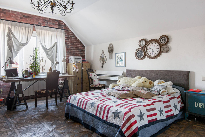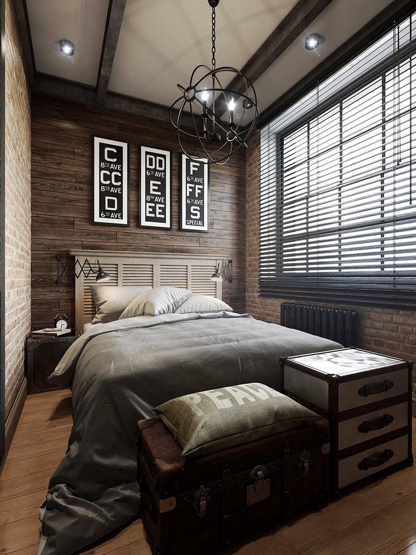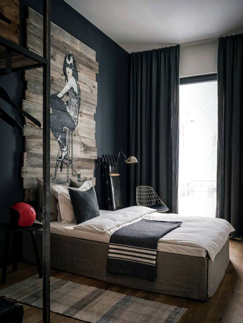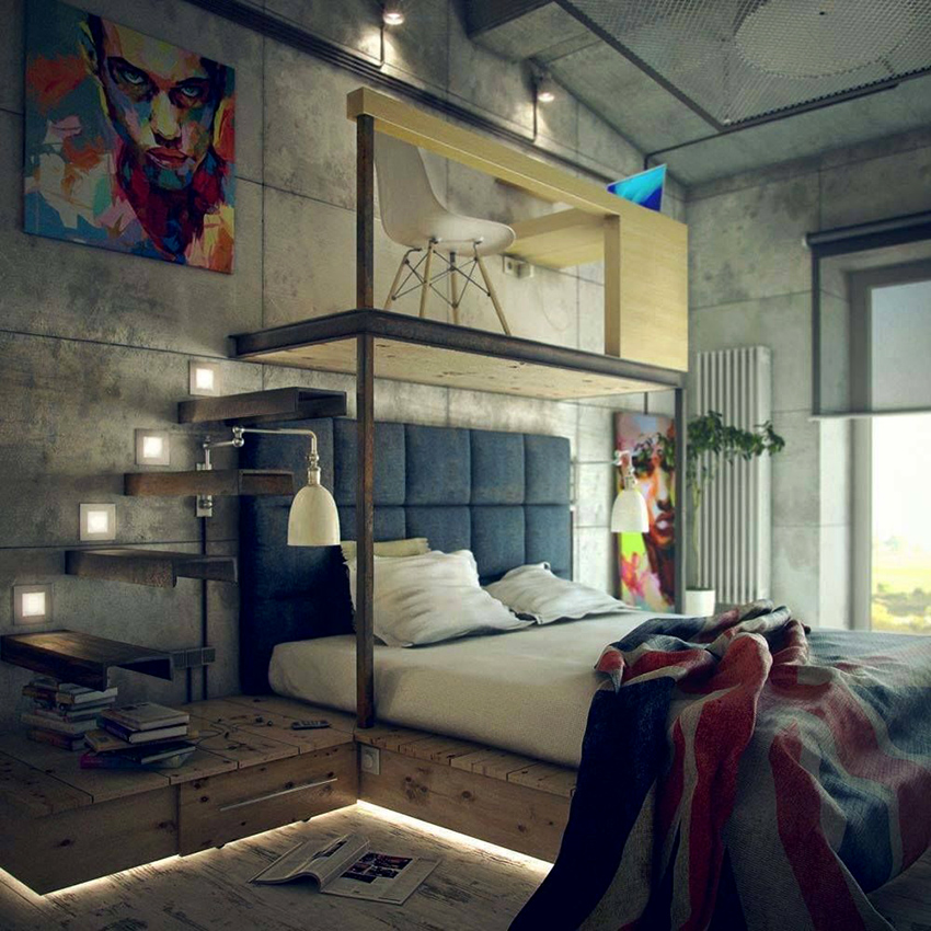 Stilul Loft primește spațiul liber și simplitatea. Această direcție este considerată cea mai laconică și puțin brutală. Tabla dintr-un astfel de dormitor poate fi realizată sub formă de zidărie, încadrată de un tavan și podea realizate din scânduri îmbătrânite artificial. Camera ar trebui să aibă un minim de mobilier, deci un singur pat va fi suficient. Sistemele de depozitare sunt cel mai bine ascunse în nișe deghizate în pereți. Este necesar ca decorul să fie prezent într-o cantitate minimă, astfel încât tăblia să fie cât mai simplă posibil.