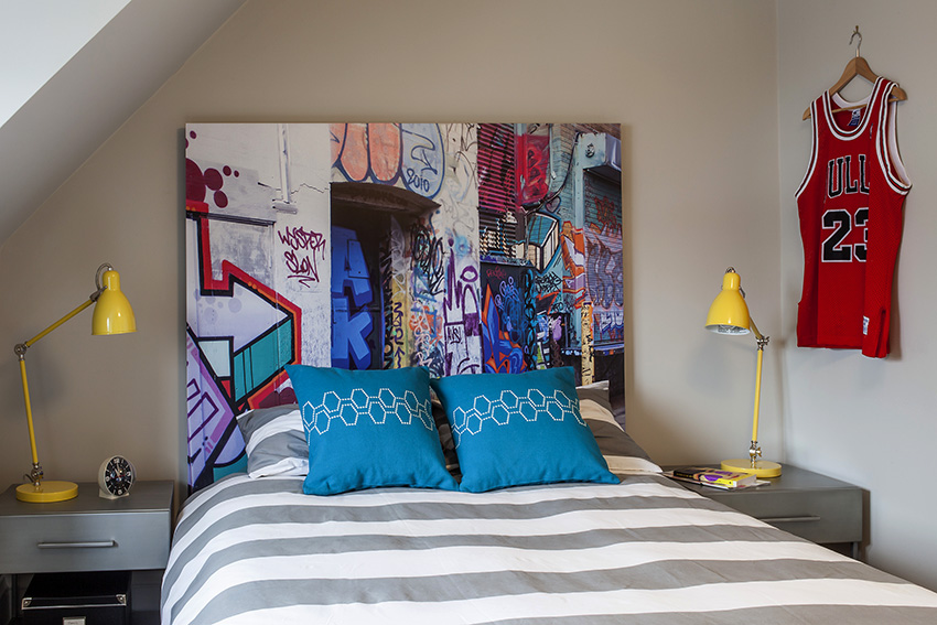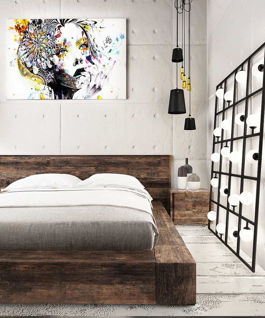 - Puteți folosi rezultatele profesiei sau hobby-ului dvs. în interior. De exemplu, în fotografie puteți vedea cum imaginea este combinată armonios cu patul, creând aspectul tăbliei sale.