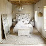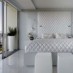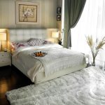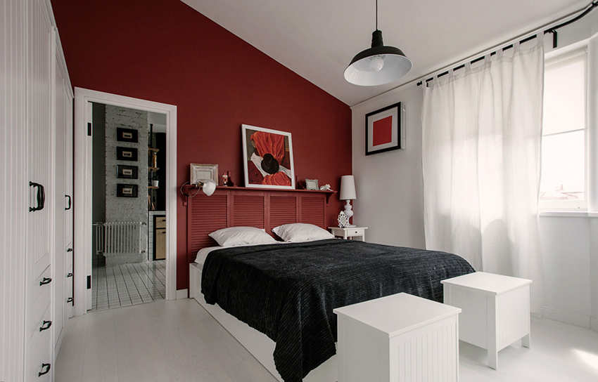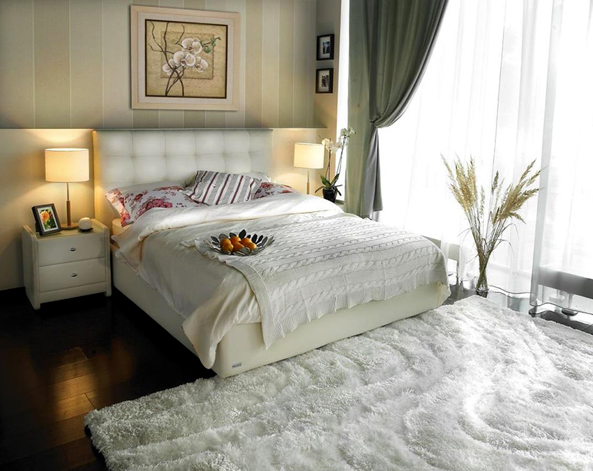 Sfat util! Merită să experimentați atunci când creați un dormitor și utilizați materiale la îndemână. Acestea pot fi rame vechi, uși, perne sau aplicații din țesături. Un pat cu o tăblie albă care imită perdelele arată rafinat.