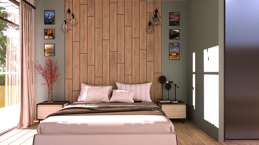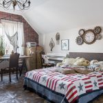 Dacă se urmărește ideea ergonomiei, atunci merită să ne oprim la produse sub formă de dulapuri și rafturi de perete. Pentru un dormitor în stil rustic în care sustenabilitatea este binevenită, un pat cu o tăblie de lemn este ideal.