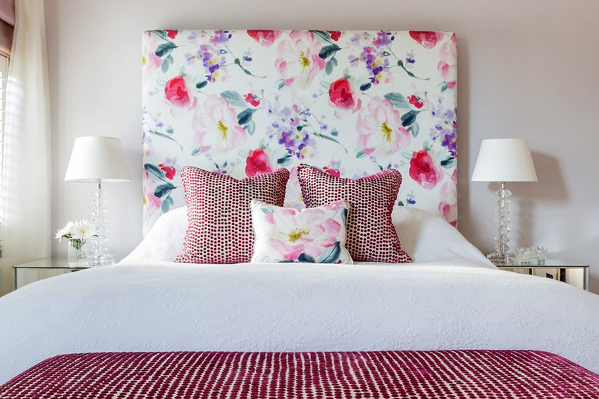 - Aplicarea imprimeurilor florale. Această opțiune este potrivită pentru fanii romantismului. Un bun exemplu este tapițeria moale a spătarului din material cu flori sau utilizarea unui panou floral în locul unei tăblii.