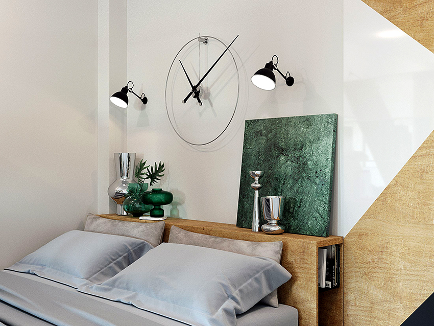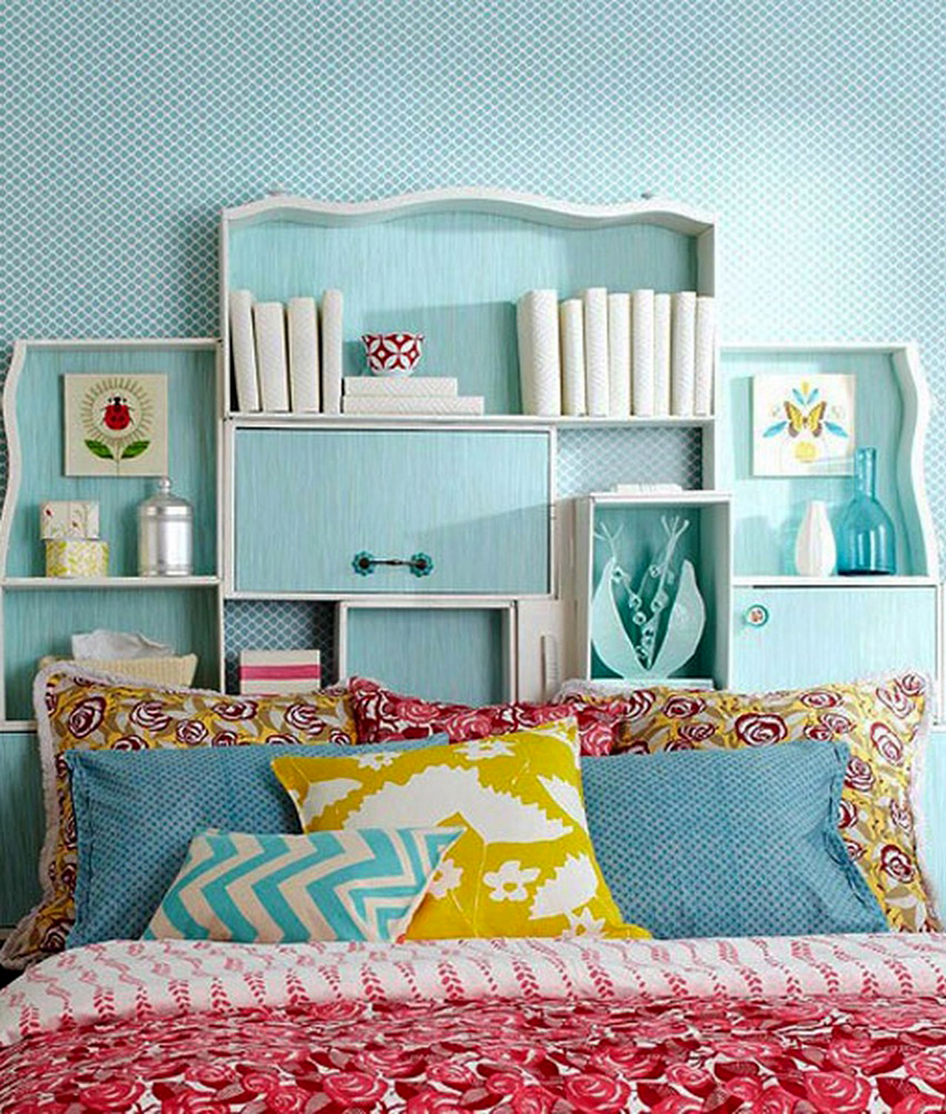 O versiune mai simplificată a unei tăblii practice pentru un dormitor mic, pe care o puteți construi cu propriile mâini, este un perete din lemn, completat de rafturi. În acest caz, nu abuzați de numărul de rafturi - două sau trei piese vor fi suficiente. Este de dorit să echipați raftul inferior cu o ușă de compartiment. Acesta va servi ca un loc pentru a stoca o varietate de lucruri mici. Această idee este relevantă pentru un interior în care nu se presupune că trebuie instalată o noptieră sau o masă de toaletă.