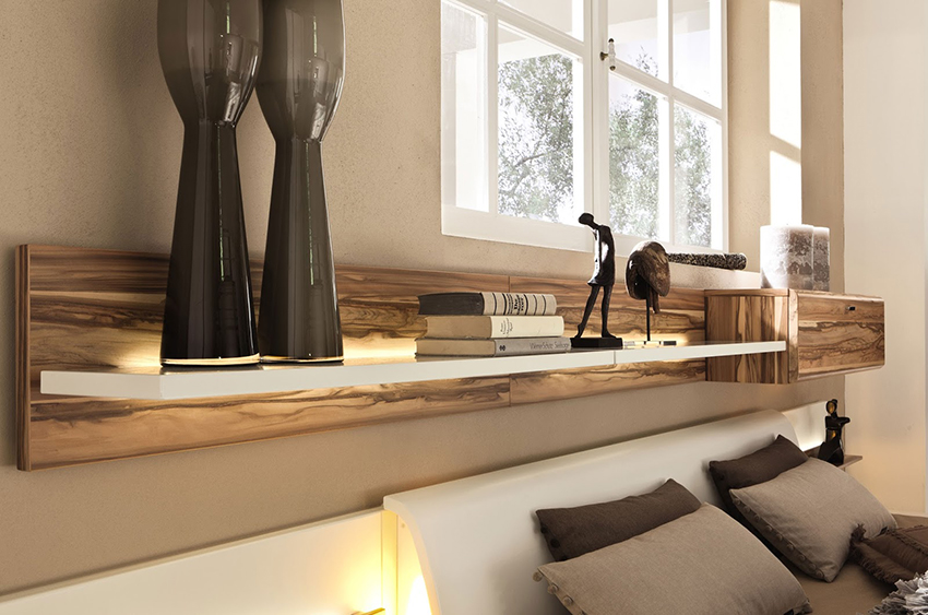 Cel de-al doilea raft, care servește ca funcție decorativă, este cel mai bine lăsat deschis. Figurinele interioare, câteva fotografii de familie și lămpile decorative vor fi destul de potrivite pe ea. Un pat dublu cu un raft în tăblie arată deosebit de frumos, ceea ce extinde vizual spațiul. Este permisă crearea unei biblioteci într-o nișă din spatele patului, dar această idee riscantă ar trebui să fie coordonată cu designerul pentru a nu pierde confortul dormitorului.