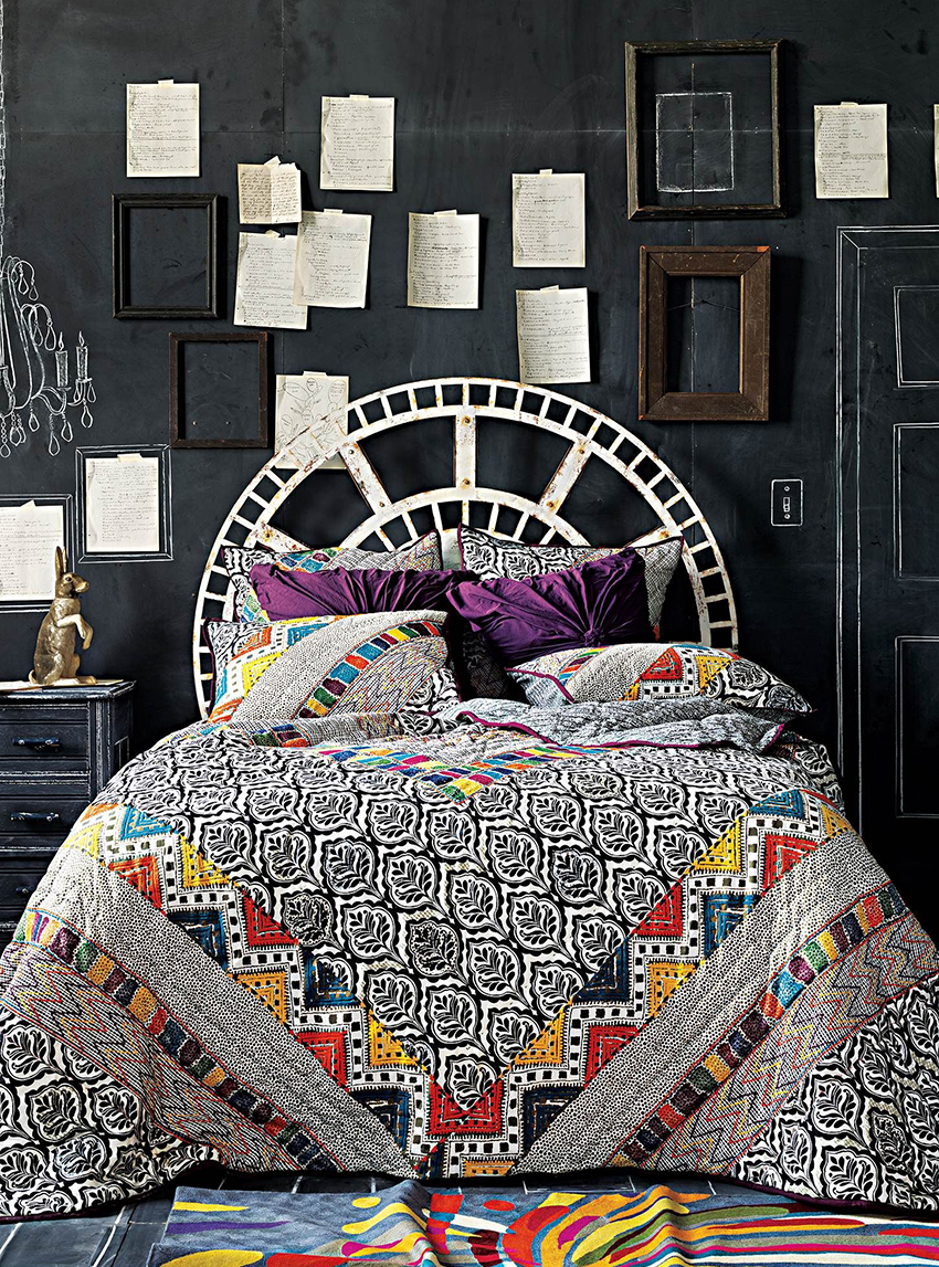 Dacă pictați un perete cu o tăblie într-o culoare opusă nuanței altor suprafețe, puteți obține efectul de zonare spațială. În stilul etno, pânzele de perete de la tăblie sunt încă relevante, dar sunt similare doar exterior cu covoarele din trecutul sovietic - textura lor este mult mai practică.
