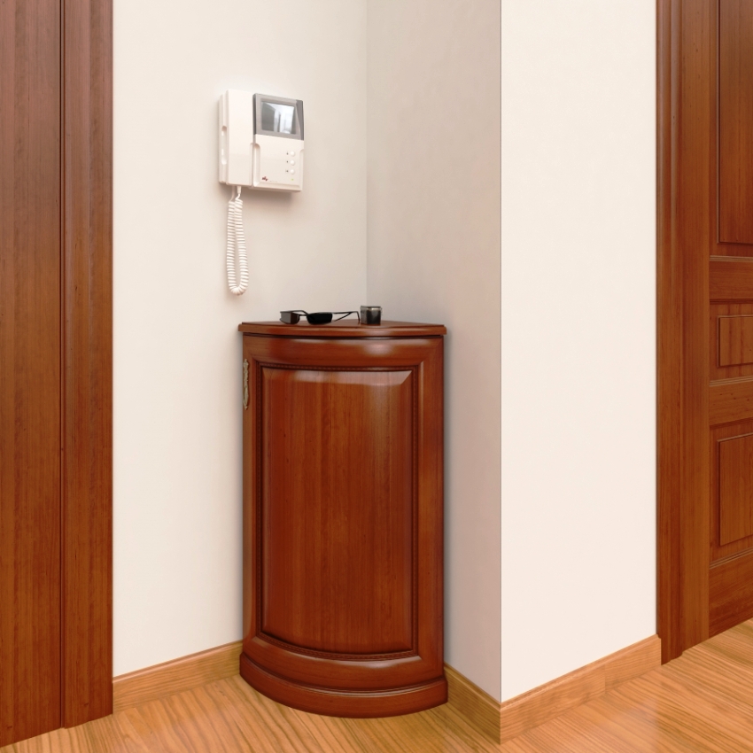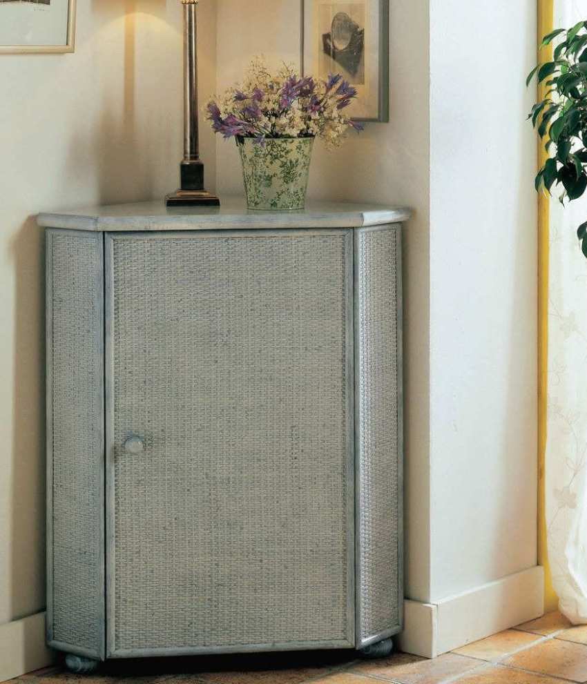 În comoda din colț, puteți depozita nu numai lucruri mici, ci chiar haine, umbrele sau încălțăminte