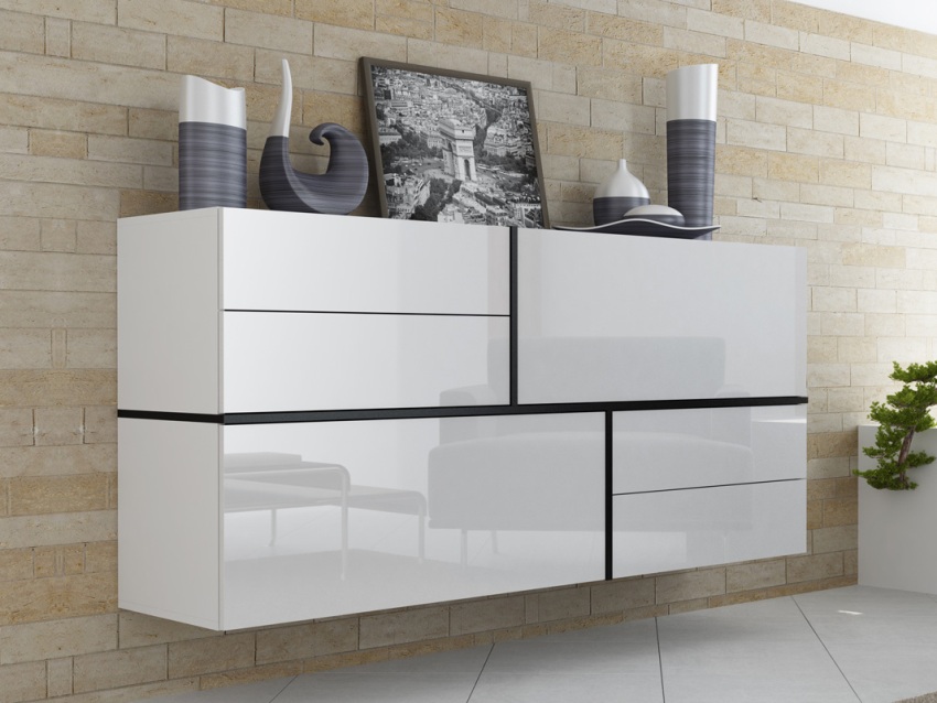Pentru acest tip de mobilier, armăturile sunt importante, care fie vor spori efectul decorativ, fie vor reduce estetica aspectului. Comodele albe pot fi instalate pe picioare și suspendate. Nu există restricții privind forma și dimensiunea produselor albe.