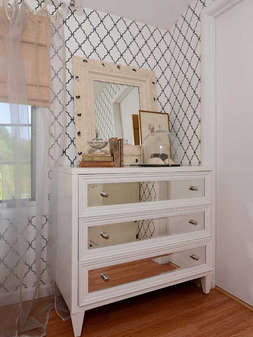 O oglindă deasupra unei astfel de comode poate fi așezată doar pe o parte, dar mai des nu este deloc agățată. Comodele din colț sunt făcute jos, 100-110 cm este limita. Suprafața superioară este utilizată pentru a amplasa elemente decorative ale interiorului: vaze, lămpi, flori de interior etc.