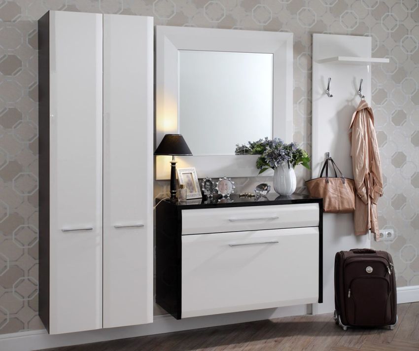 Mobilierul alb face interiorul expresiv. De ce nu poate fi el așa pe hol?! În plus, praful și murdăria sunt vizibile pe orice suprafață, chiar și pe negru, și, de asemenea, pe lucios, atunci se observă chiar și o cantitate mică. Deci, din punct de vedere practic, albul nu este o problemă.