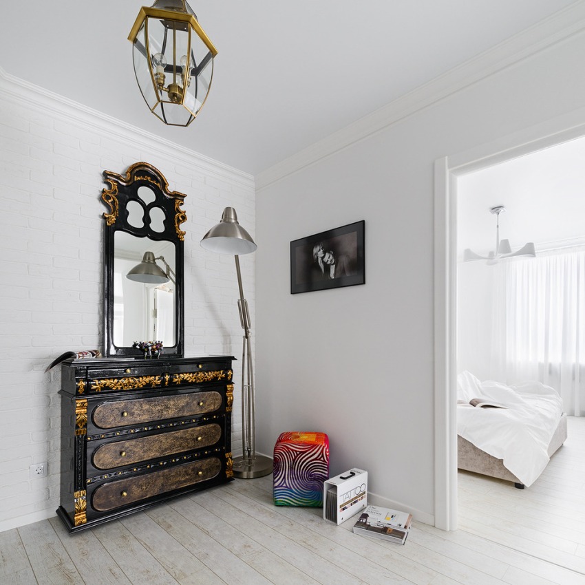 Comoda albă pe hol este un clasic care va surprinde și fascina chiar și într-o astfel de cameră care nu dispune de sentimentele estetice ca pe un coridor.