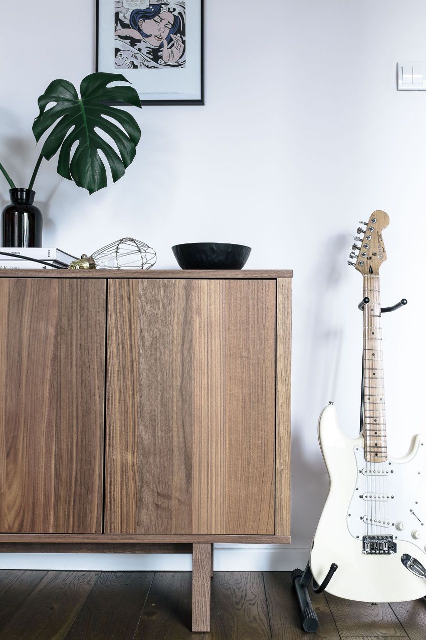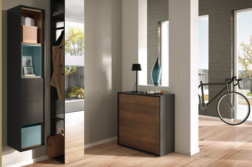 Printre sertarele suspendate de pe hol, structurile din două tipuri de materiale, care diferă nu numai în nuanțe de culoare, ci și în grosime, prezintă un interes deosebit. O cutie mai masivă și mai întunecată acoperă fațada din panouri ușoare și subțiri pe bază de lemn.