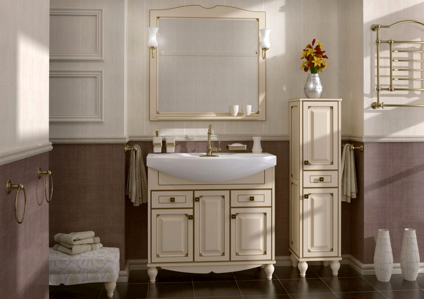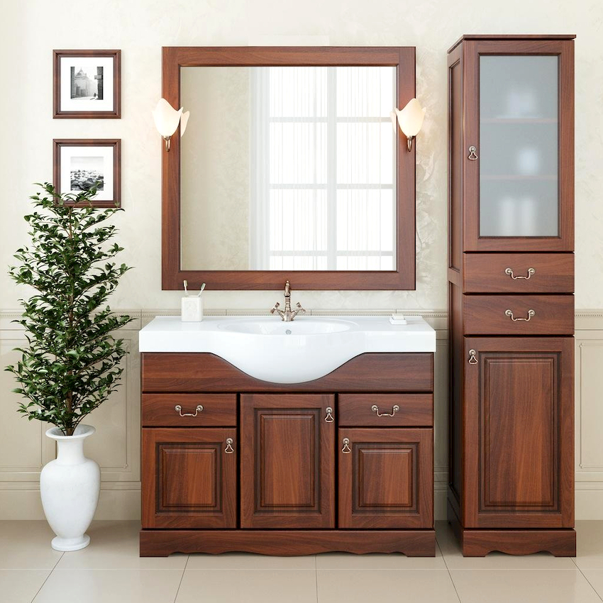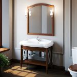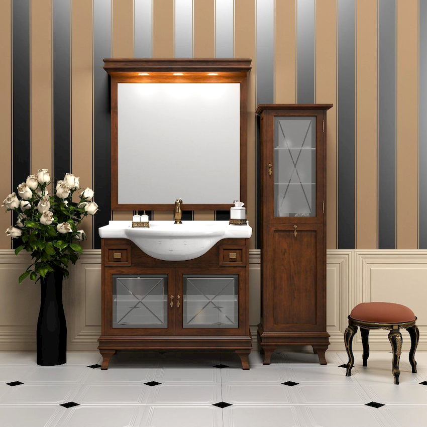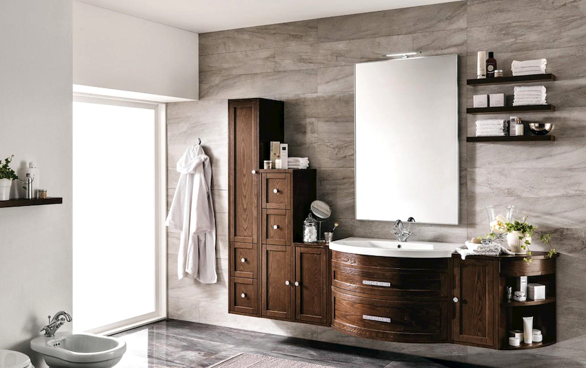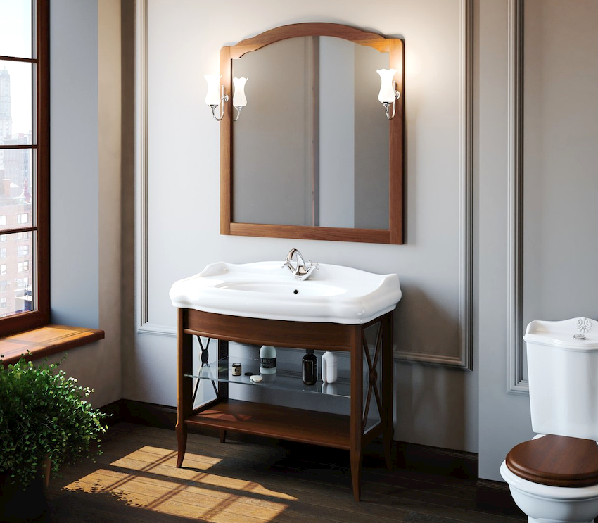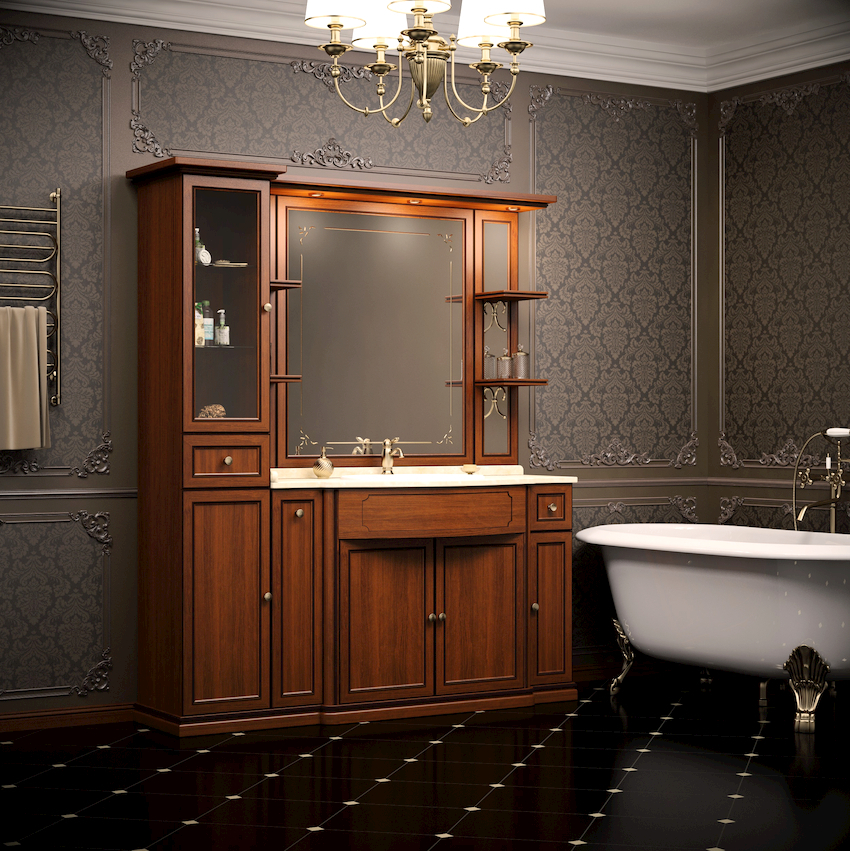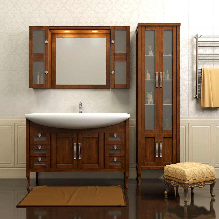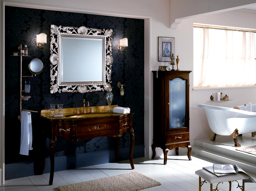 - Dimensiunile camerei. Este important ca după instalarea tuturor obiectelor, golurile dintre ele să permită mișcarea liberă prin cameră. Mobilierul clasic de baie din lemn masiv este cel mai bine lăsat pentru decorarea camerelor mari din case private sau apartamente mari.