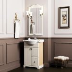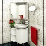 O altă modalitate de a economisi spațiu este plasarea unui dulap de colț cu o chiuvetă, care nu numai că va ajuta la amenajarea unui loc pentru spălarea mâinilor, ci și la acoperirea racordurilor de apă și a conductelor. În funcție de situație, puteți face mobilier de baie la comandă, puteți cumpăra seturi gata preparate sau vă puteți crea singuri. Dacă vorbim despre mobilierul de baie clasic, atunci acestea includ următoarele elemente: