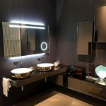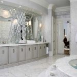 - oglindă peste chiuvetă cu rafturi din sticlă;