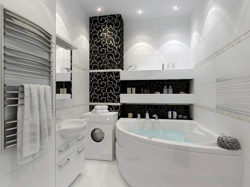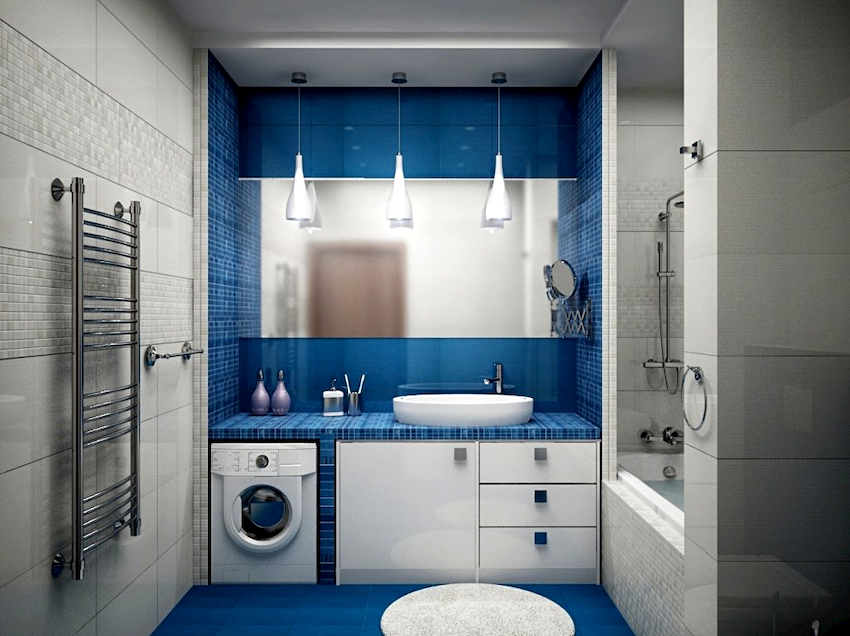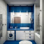 Mulți oameni preferă să instaleze o mașină de spălat în baie, mai ales dacă spațiul permite. Dacă realizați un dulap special pentru mașină, suprafața acestuia va deveni o masă excelentă, deasupra căreia puteți instala suplimentar un dulap cu oglinzi sau rafturi articulate deschise.