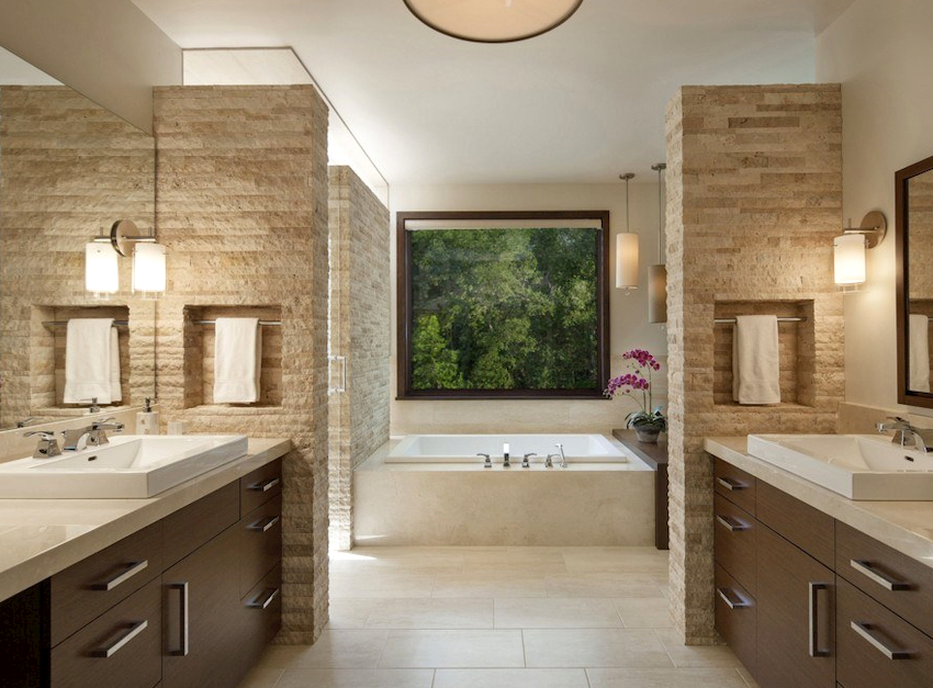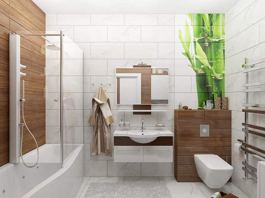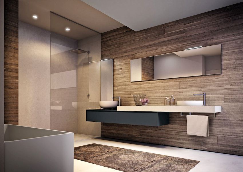 Seturile de baie în aspect ar trebui să se potrivească cu finisajul suprafeței în textură și culoare