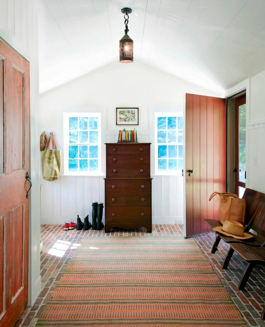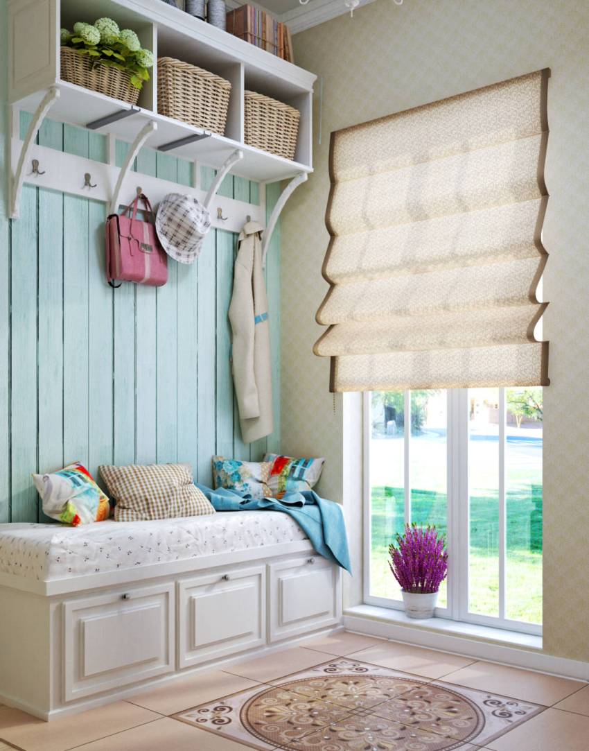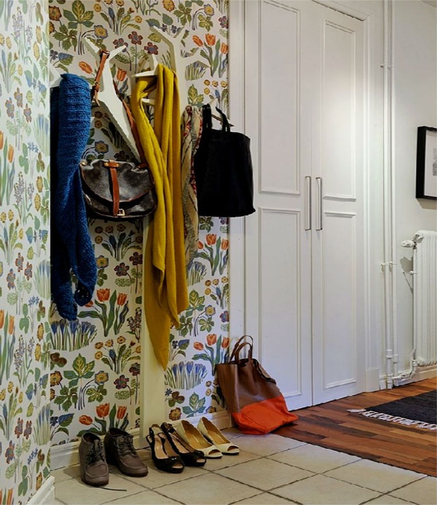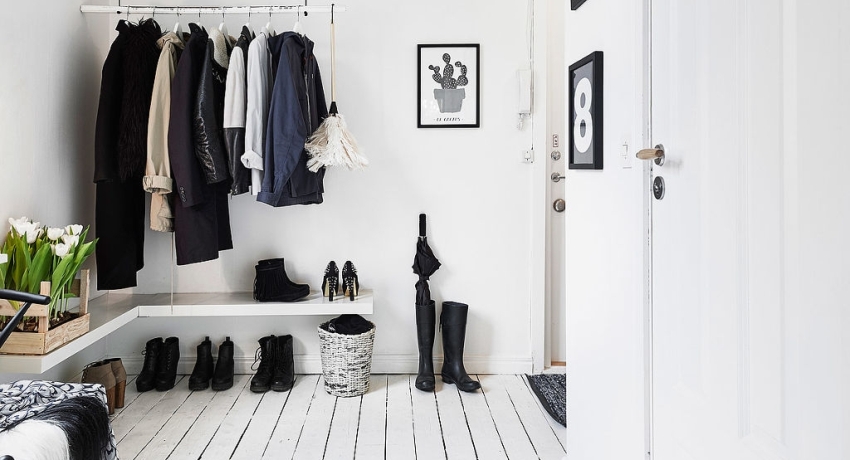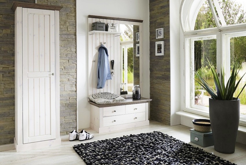 Stilul scandinav se inspiră din natura nordului. Se bazează pe pereți albi ca zăpada, folosind tonuri de albastru și albastru. Pardoseala albă din lemn sau plăcile etnice arată frumos. Un covor luminos de podea lângă zona pantofilor va ajuta la diluarea aspectului camerei și va adăuga căldură și culoare.