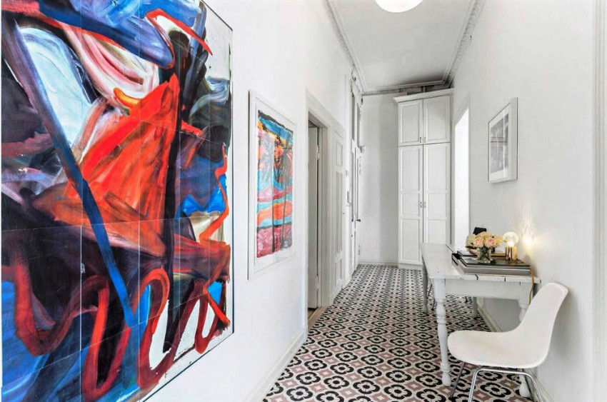 În lungimea îngustă a holului, este mai bine să folosiți culori deschise cu un anumit punct luminos de accent