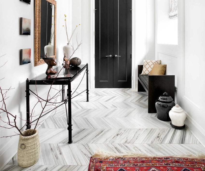 Combinarea materialelor este o tehnică eficientă. Deci, în partea de intrare este mai bine să utilizați plăci rezistente la uzură. Pentru a vă menține picioarele confortabile, puteți pune în continuare o acoperire mai caldă.