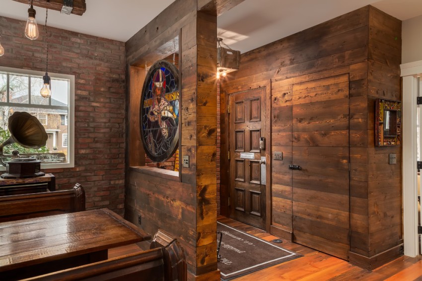 Interiorul holului din casă are cel mai adesea la dispoziție un spațiu mare. În unele cazuri, aici se află o fereastră. În această situație, este mult mai ușor să echipați o cameră, deoarece nu trebuie să economisiți spațiu și puteți aloca o zonă pentru depozitarea lucrurilor și a încălțămintei. Dacă există o fereastră mare în interior, atunci trebuie să fie făcut un detaliu decorativ al camerei. Pentru aceasta se folosesc inserții de vitralii sau sticlă colorată. De asemenea, ar trebui să acordați atenție alegerii corecte a perdelelor. Prezența unei ferestre vă permite să faceți camera mai rezidențială și mai luminoasă.