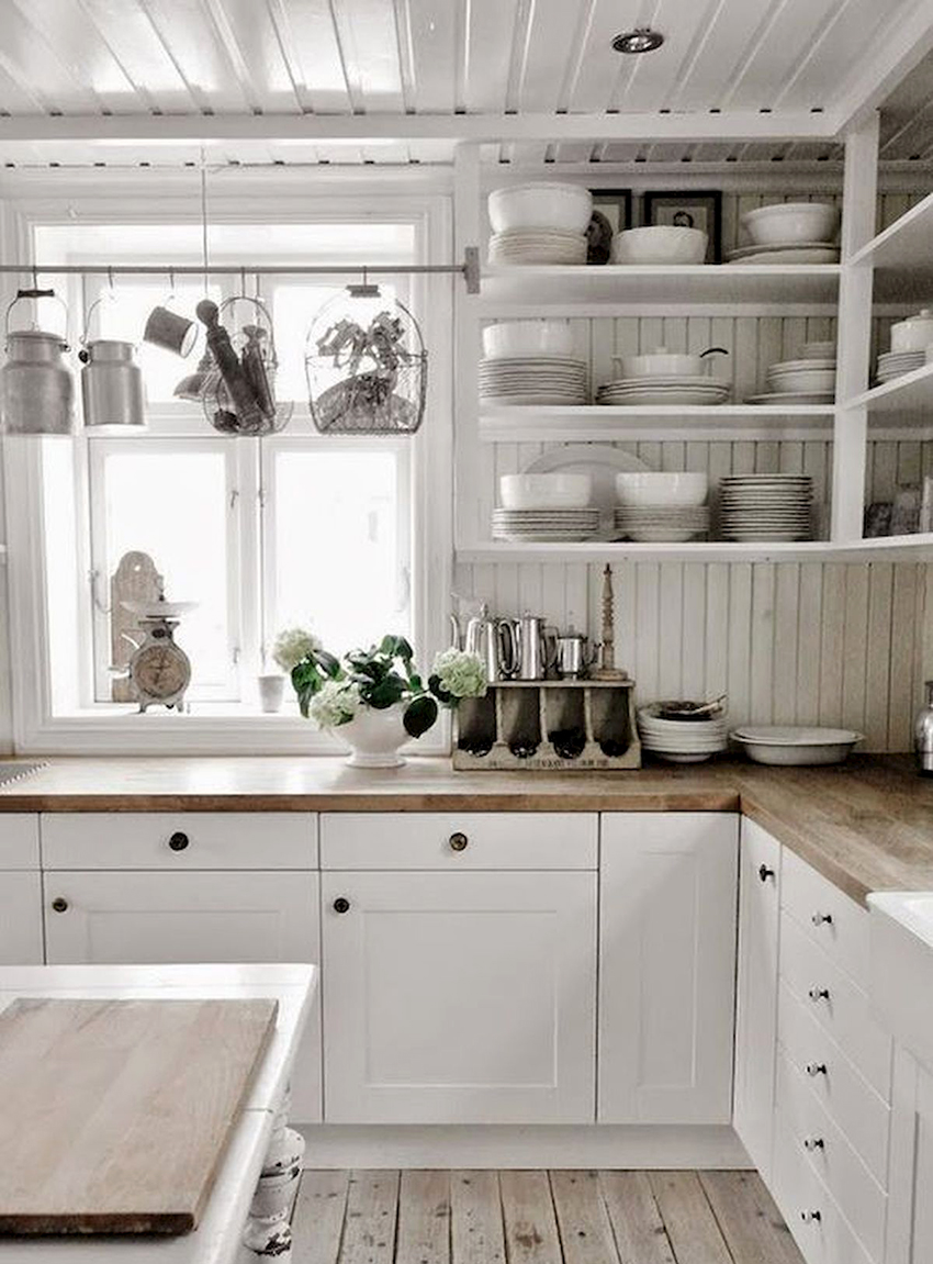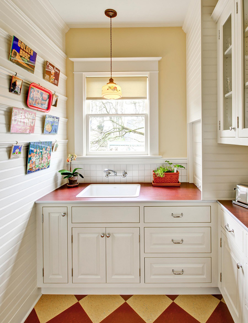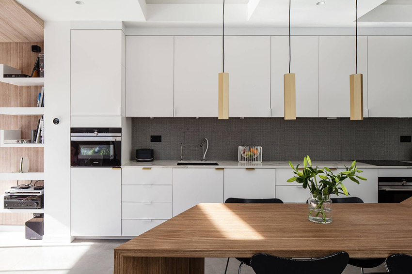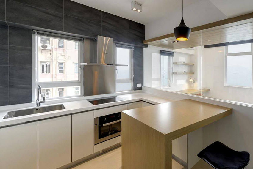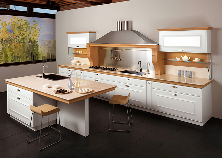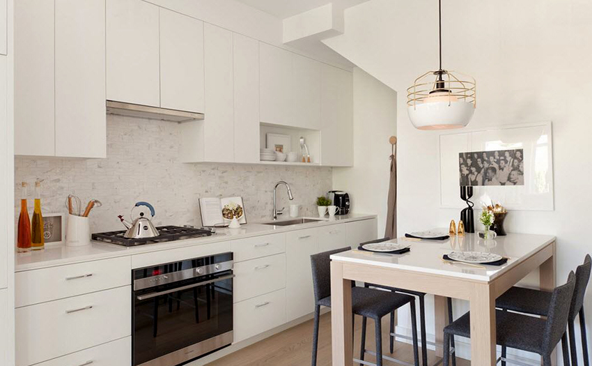 Každá kuchyňa môže byť rozdelená do dvoch funkčných oblastí: jedálenská a pracovná. Jeden z nich sa používa na jedenie a odpočinok a druhý na priame varenie. Pracovný priestor pozostáva z plynového alebo elektrického sporáka, umývadla a dosky. Tieto prvky sa zvyčajne inštalujú proti stene vedľa seba a tvoria jednu líniu.