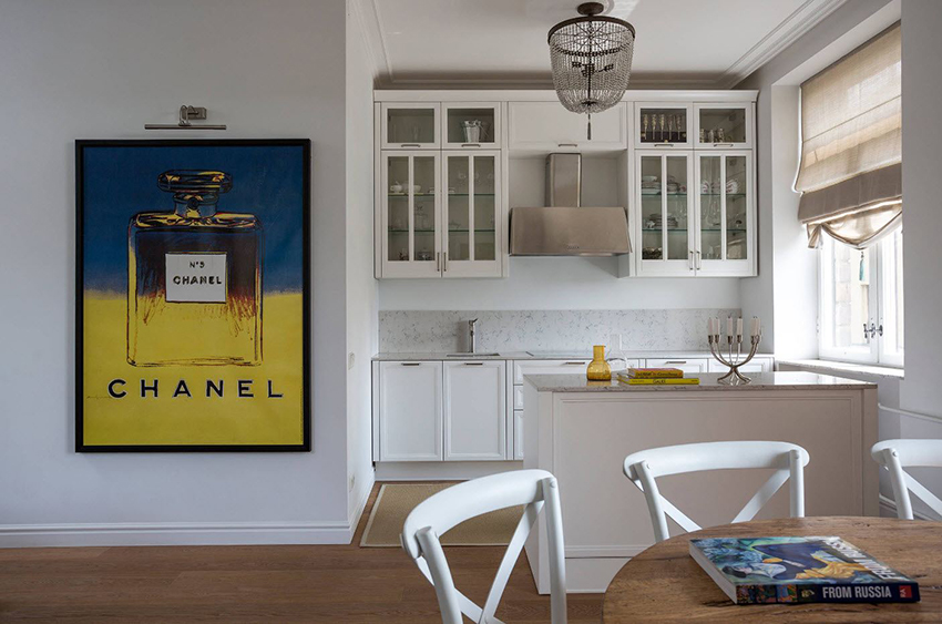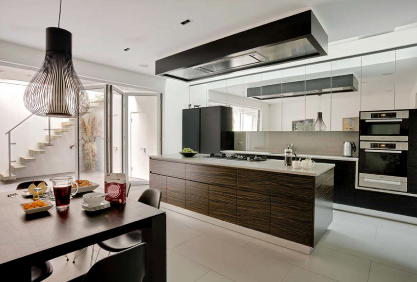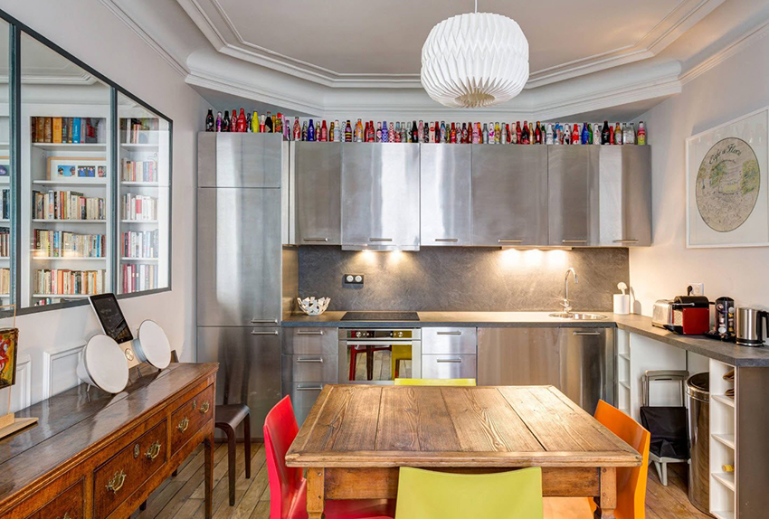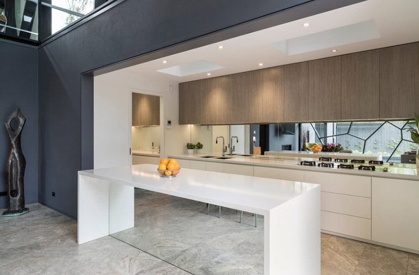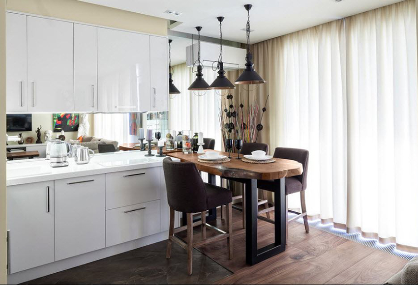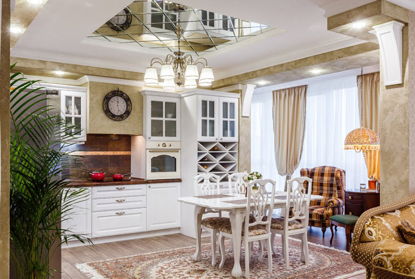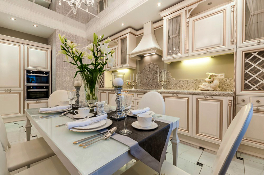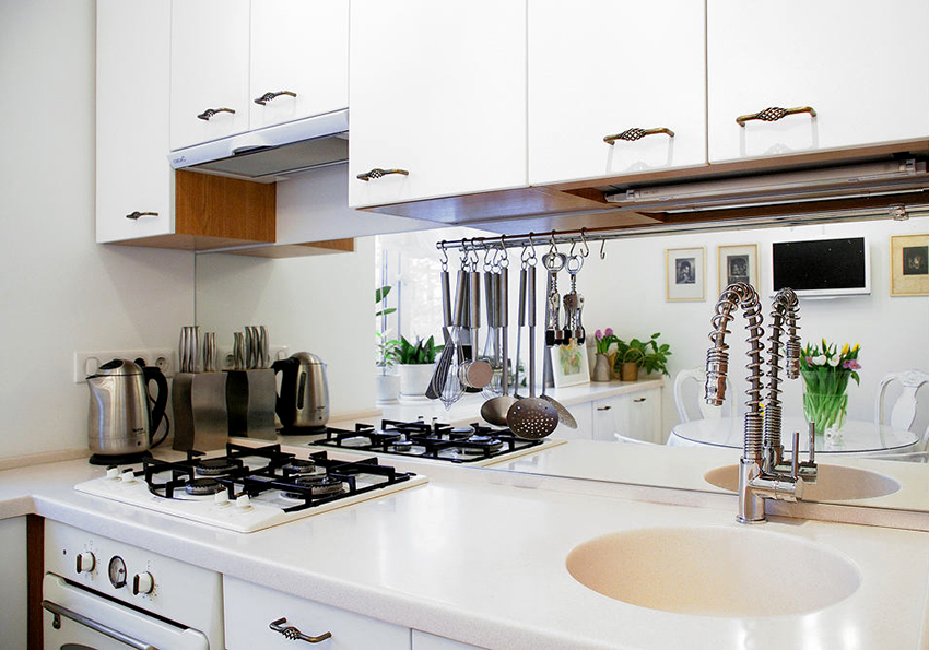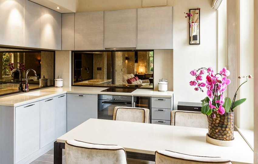 Pred výberom zrkadla ako dekorácie pre pracovný priestor v kuchyni je potrebné vziať do úvahy jednu dôležitú nuansu. Reflexná plocha nielen vizuálne zväčšuje priestor v miestnosti, ale „zdvojnásobuje“ neporiadok a množstvo riadu na stole. Aby ste predišli pocitu neporiadku, je vhodné v takejto kuchyni udržiavať dokonalú čistotu a tiež čo najviac „vyprázdniť“ interiér, to znamená odstrániť z povrchov nepotrebné predmety (riad a malé domáce spotrebiče schovať do skrinky). Okrem toho sa neodporúčajú strešné lyžiny.