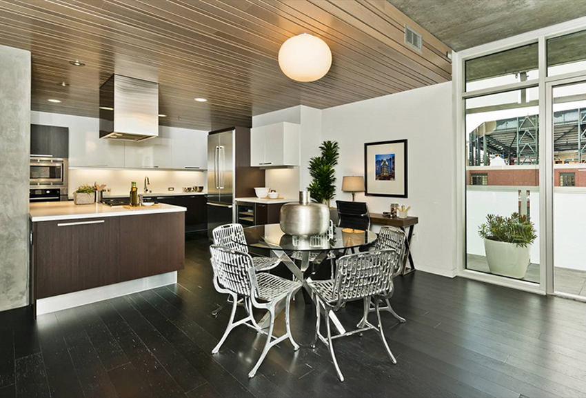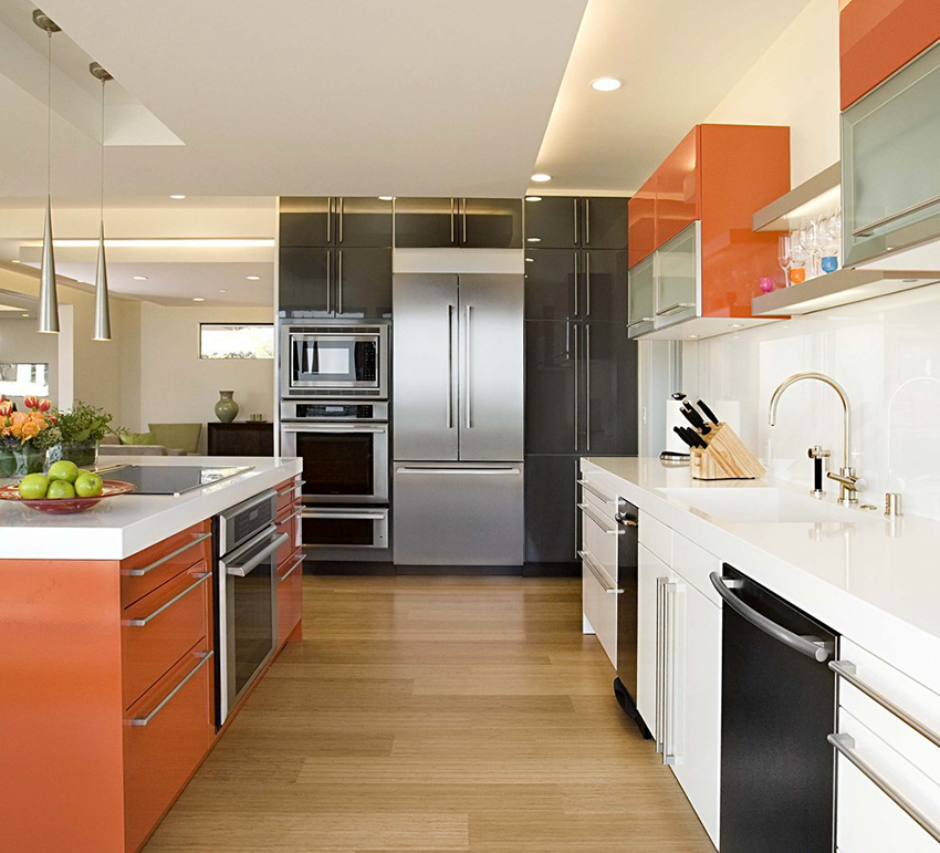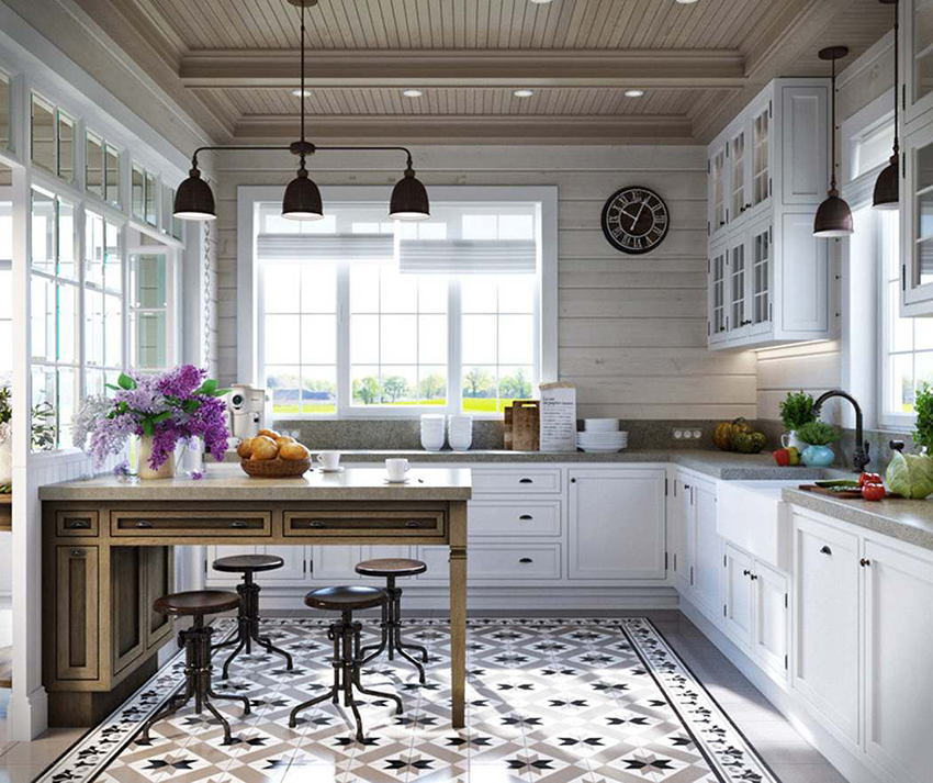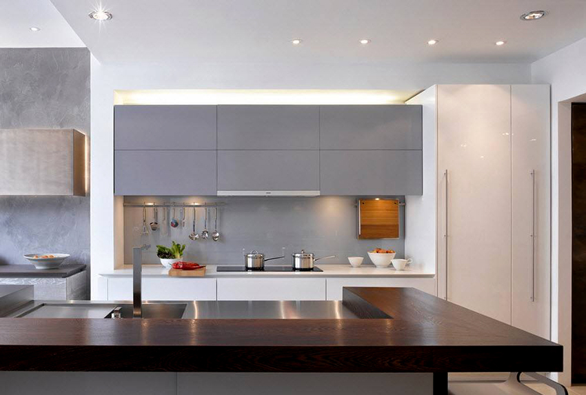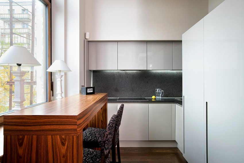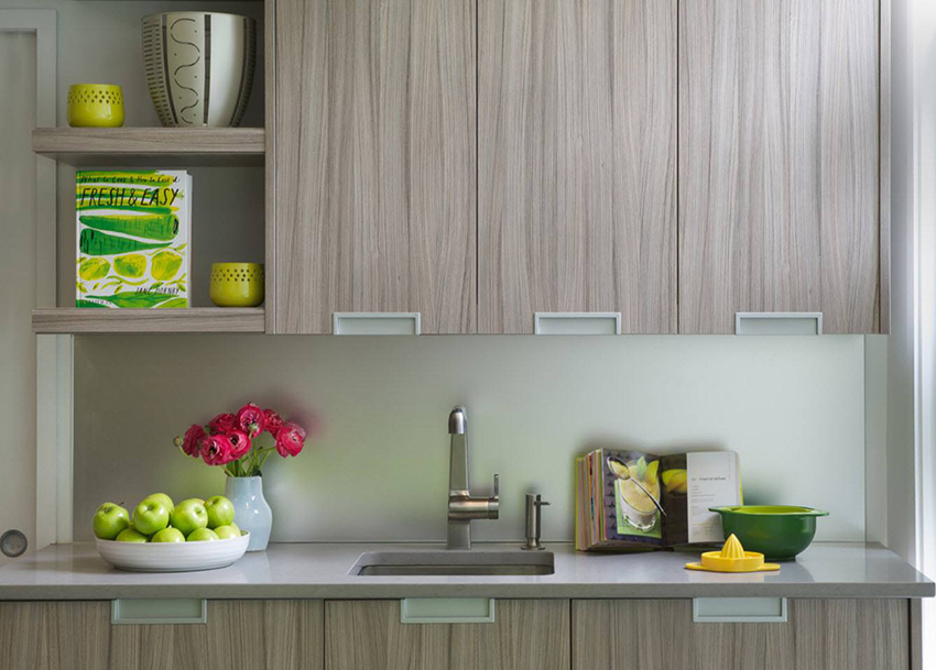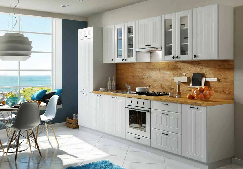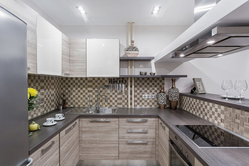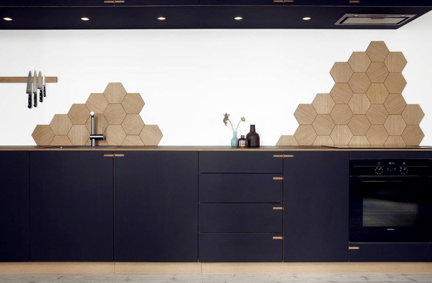 - schopnosť zvoliť dizajn zástera pre kuchynskú súpravu, ktorá bude opakovať farby a textúru fasád alebo dosiek s dreveným alebo kamenným povrchom;