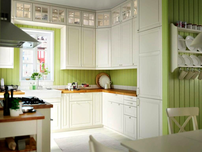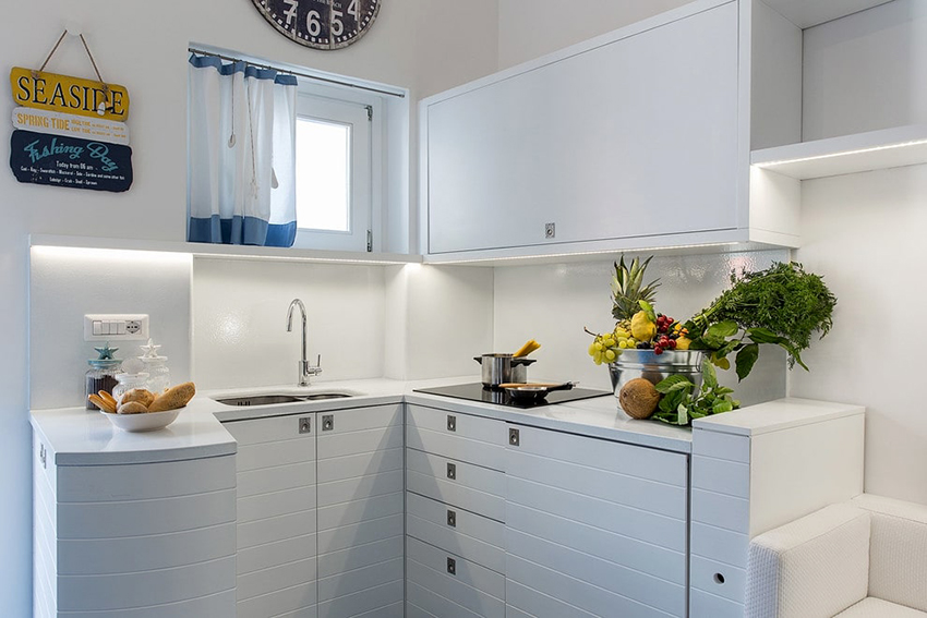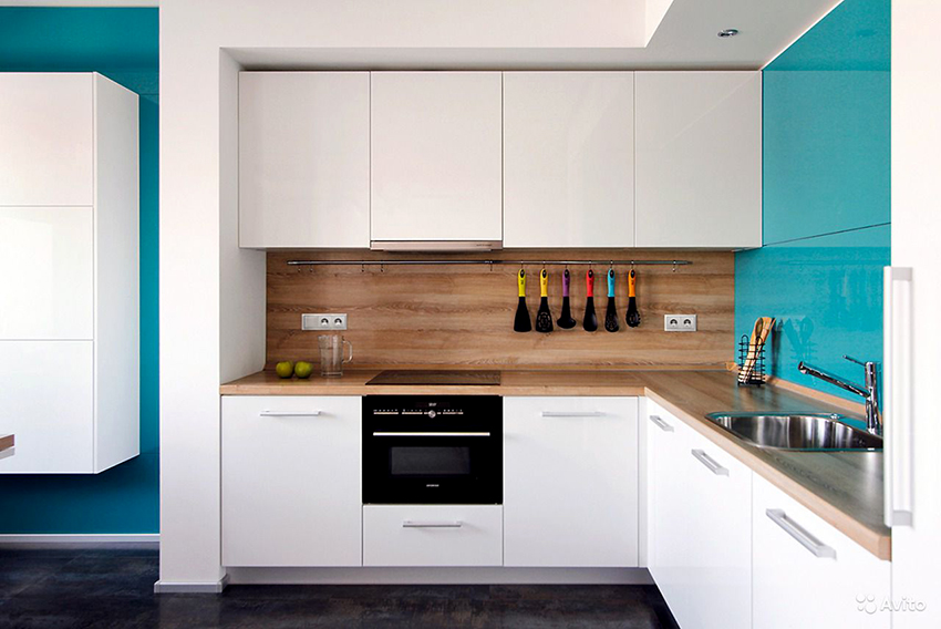 Užitočná rada! Ak sú skrinky náhlavnej súpravy vybavené zatváračmi dverí, ktoré sa otvárajú smerom nahor, je vhodné mierne odrezať výšku zástera, inak bude nepohodlné takýto nábytok používať.