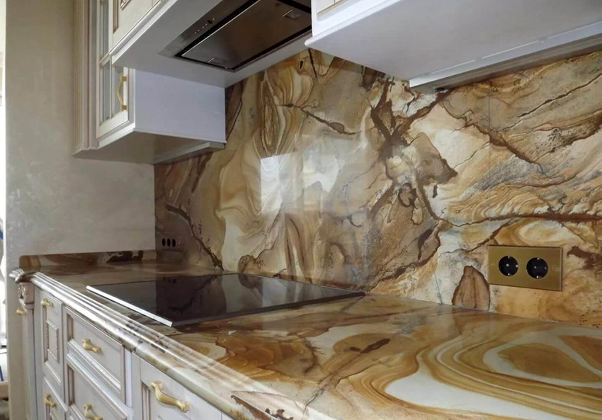 Onyx je krásny prírodný kameň s jasnými a pestrými farbami a škála odtieňov tohto materiálu je veľmi rozmanitá. Pri vytváraní kuchynského interiéru okolo zástera s takým honosným dizajnom je veľmi dôležité, aby ste ho nepreťažili. Pre miestnosť je vhodné zvoliť textil a kusy nábytku vyrobené v upokojujúcich farbách, pretože onyx bude hrať úlohu hlavného prízvuku.
