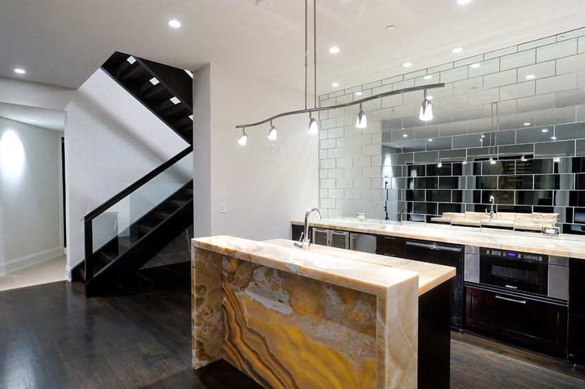 Ak chcete získať pevný a krásny interiér, môžete podporiť dizajn kuchynskej zástery z ónyxu zavesením dekoratívneho predmetu z rovnakého materiálu na stenu. Tento kameň má priesvitnú štruktúru. Kombináciou tohto materiálu s LED podsvietením môžete dosiahnuť zaujímavý efekt.