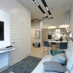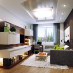 V prvej etape by sa mal určiť účel obývacej izby, ktorú je možné v prípade návrhu garsónky rozdeliť na samostatné zóny. Spoločný priestor môžete vizuálne rozdeliť na samostatné funkčné oblasti zmenou úrovne podlahy alebo stropu, svetelných prvkov, použitím otvorených políc a sklenených priečok.Takéto dizajnérske triky, ktoré sa dostali do života, možno vidieť na fotografii interiérového dizajnu haly v štúdiovom apartmáne. Kuchyňu a obývací priestor je možné rozdeliť pomocou barový pult.
