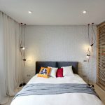 Strop by mal byť zdobený tónom svetlejším ako steny. Takto dodáte malému priestoru ďalšiu výšku. Maximálnu slobodu prinesie použitie reflektorov, malých lustrov, nástenných svietnikov, malých tienidiel visiacich paralelne so stropom. Na príklade interiéru malého bytu (fotografia to potvrdzuje) bolo použité kombinované osvetlenie pomocou jasných reflektorov a nástenných svietnikov.