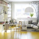 Ďalším efektívnym riešením vizuálneho zväčšenia miestnosti je rovnaká podlahová krytina v celom byte, ktorá spojí všetky konštrukčné prvky bytu do jedného priestoru aj napriek rôznym štýlom dekorácie každého z nich. Takýto návrhársky nález je uvedený na fotografii interiérov dvojizbového bytu s rozlohou 54 m².