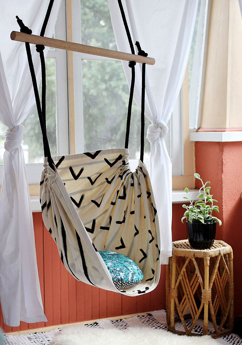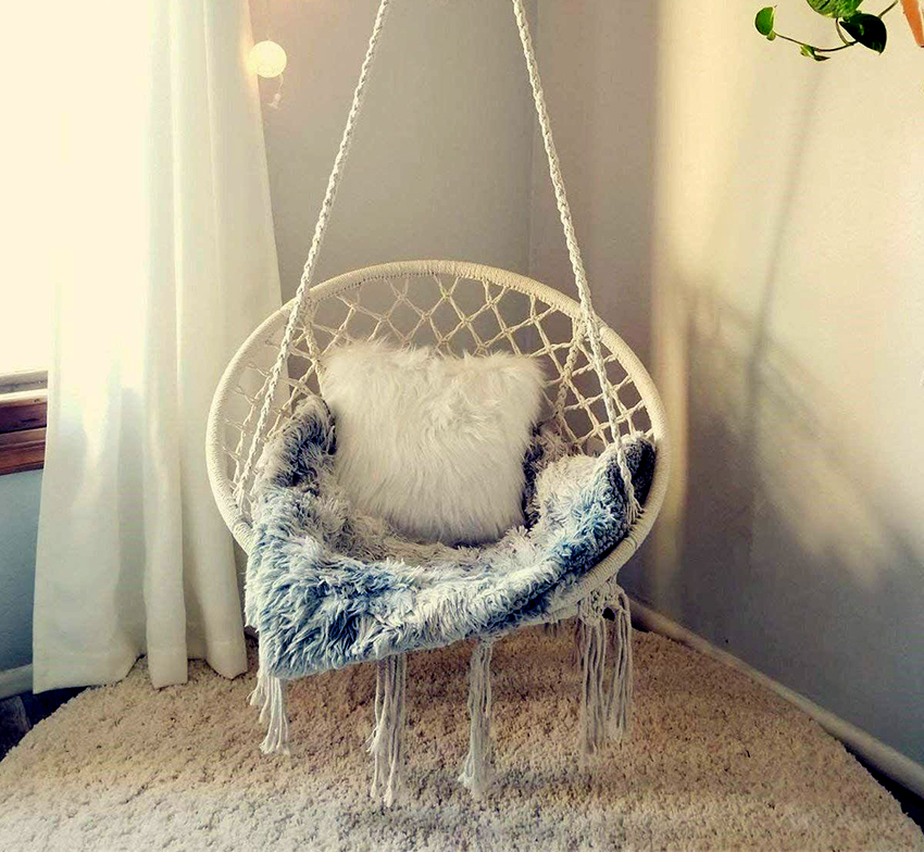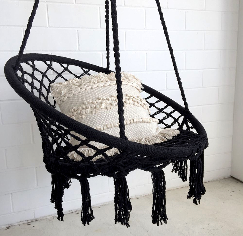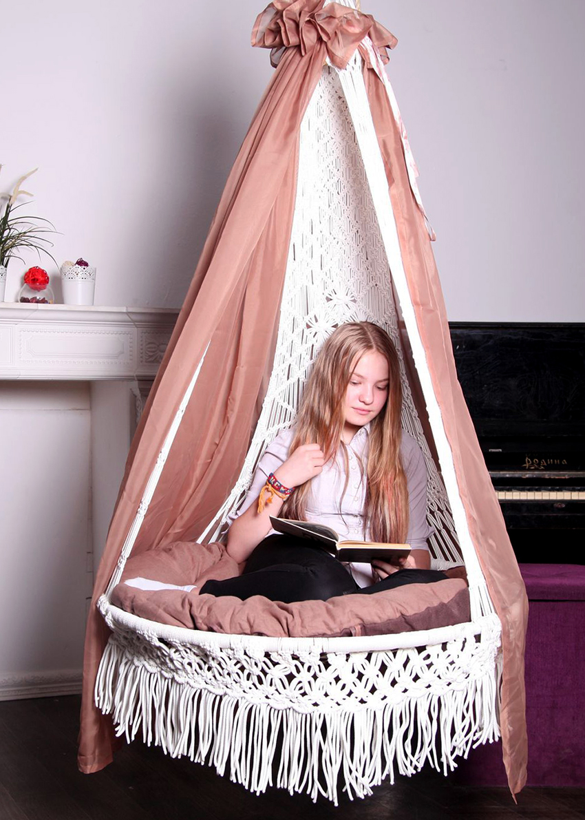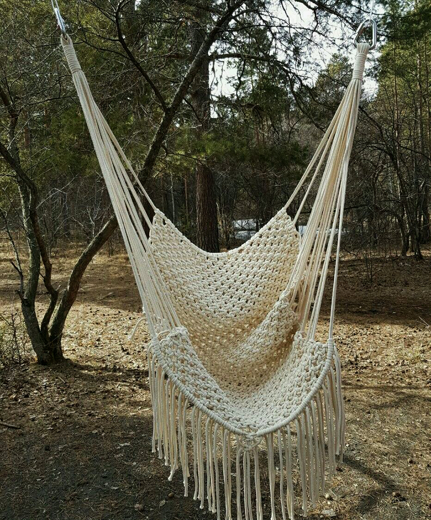 ไม่ใช่วิธีที่ง่ายที่สุด แต่สะดวกที่สุดคือเก้าอี้เปลญวน Macrame แบบแขวน DIY ซึ่งใช้โครงแข็ง ส่วนใหญ่มักใช้ห่วงยิมนาสติกหรือท่อพีวีซีสำหรับสิ่งนี้ นอกจากเทคนิค macrame แล้วยังสามารถใช้สิ่งทอธรรมดาได้ แต่เปลญวนเหล่านี้ดูไม่โปร่งสบาย