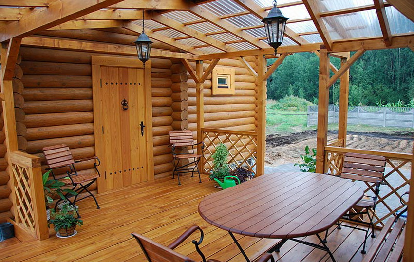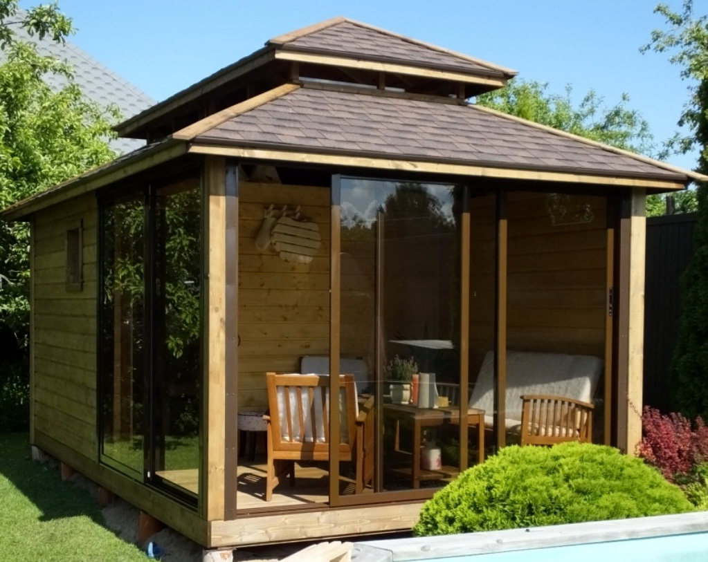 - ศาลาเปิดโอกาสให้ออกจากห้องอาบน้ำเพื่อสูดอากาศบริสุทธิ์ ในกรณีนี้คุณไม่จำเป็นต้องยืนอยู่บนสนาม แต่คุณสามารถนั่งที่โต๊ะได้อย่างสบาย