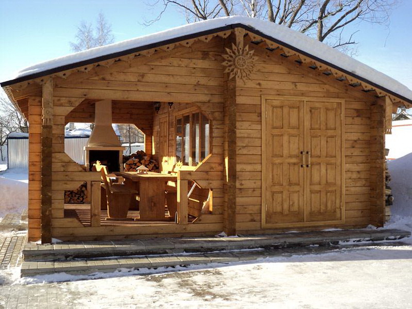 สำหรับผู้ที่ไม่ต้องการใช้เวลาและความพยายามในการดำเนินโครงการที่ซับซ้อนและซับซ้อนมีตัวเลือกที่ง่ายกว่า หลังคาในกรณีนี้จะแหลมซึ่งช่วยลดความยุ่งยากในขั้นตอนการก่อสร้างและประหยัดเงิน แม้ว่าขนาดของอาคารจะไม่เกิน 2.6x2.0 ม. สิ่งนี้จะช่วยให้คุณสามารถวางทุกสิ่งที่คุณต้องการรวมถึง เตาอั้งโล่ หรือบาร์บีคิว