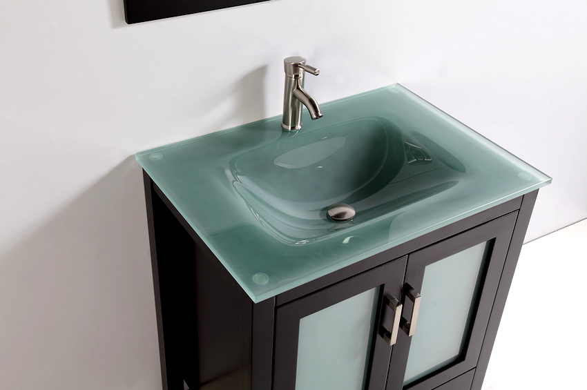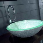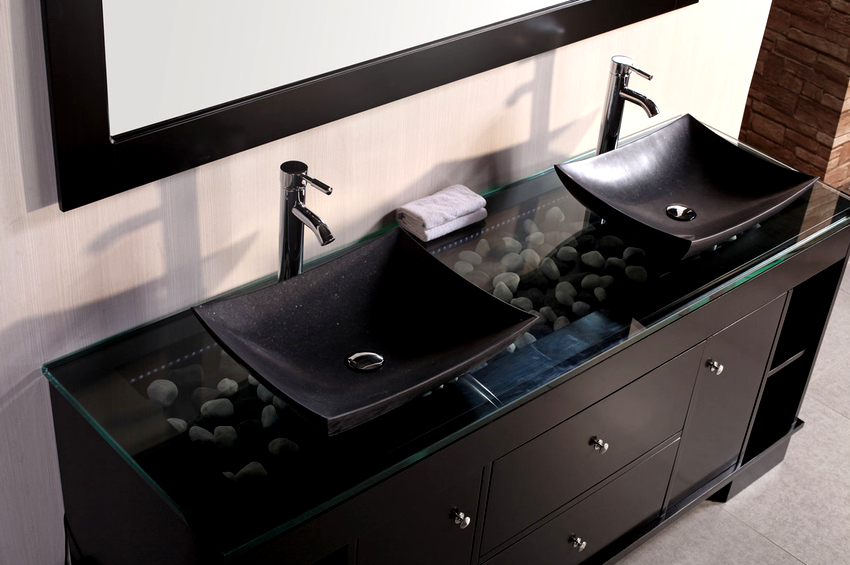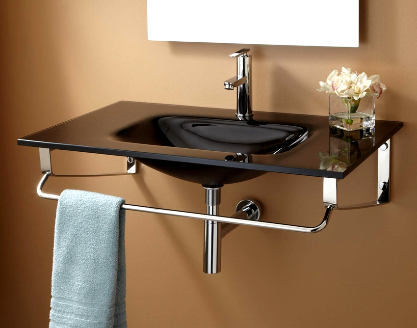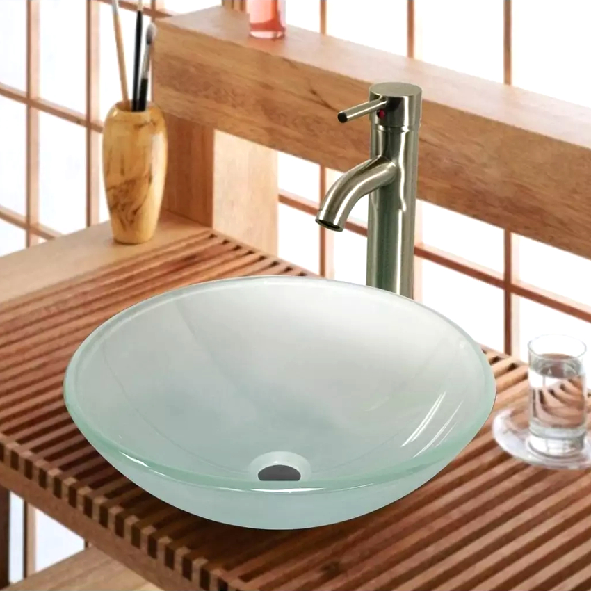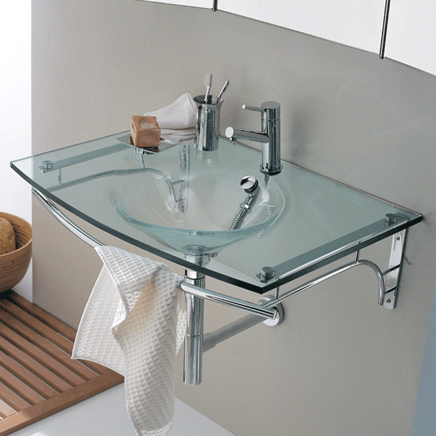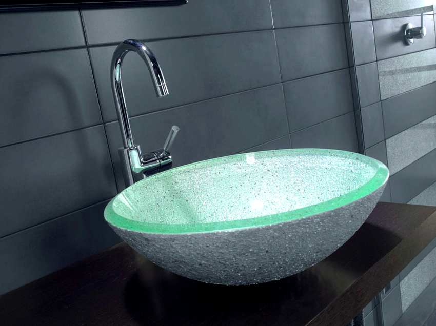 ในอ่างล้างหน้าเหนือศีรษะมีกระจกหลายรุ่นทั้งแบบสีหรือแบบด้านและแบบใส ส่วนใหญ่มักจะติดตั้งบนโต๊ะกระจก การรวมกันนี้ทำให้โครงสร้างมีน้ำหนักเบาน่าสนใจและมักเปลี่ยนเป็นองค์ประกอบสำคัญของการตกแต่งภายใน