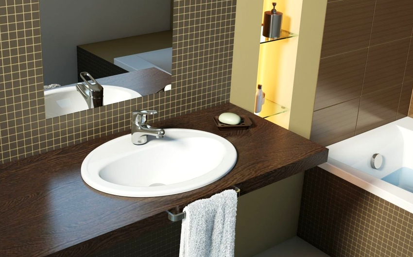 อ่างล้างหน้าเหนือศีรษะพร้อมเคาน์เตอร์สามารถติดตั้งตามผนังหรือเข้ามุม นอกจากนี้ยังสามารถใช้ตำแหน่งที่แยกได้หากไม่มีปัญหาในการนำการสื่อสาร
