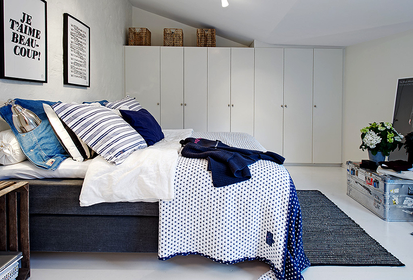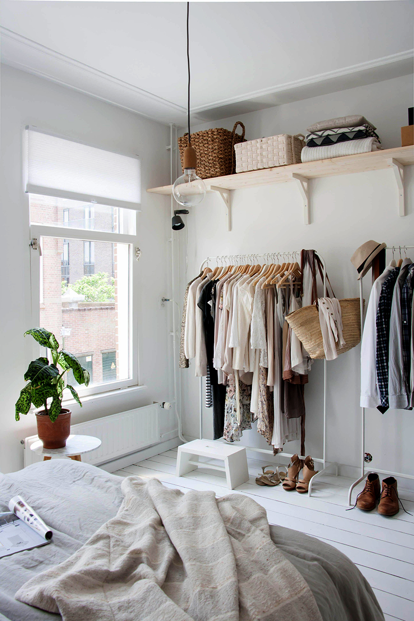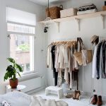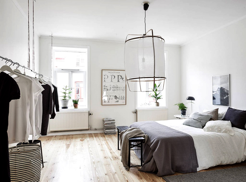 Pinapayagan ka ng mga maluluwang na kuwarto na mag-install aparadorna maaari mong gamitin upang maiimbak ang iyong aparador. Kapag lumilikha ng isang kapaligiran para sa isang compact room, mas mahusay na tanggihan ang isang malaking gabinete. Maaari itong mapalitan ng mga riles ng damit o bukas na istante. Ang mga storage system na ito ay ganap na bukas, hindi nila itinatago ang libreng puwang sa silid, tulad ng ginagawa ng mga wardrobes.