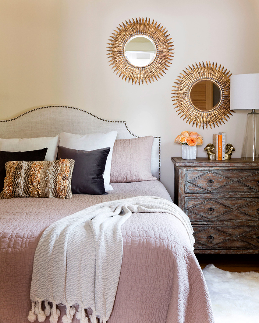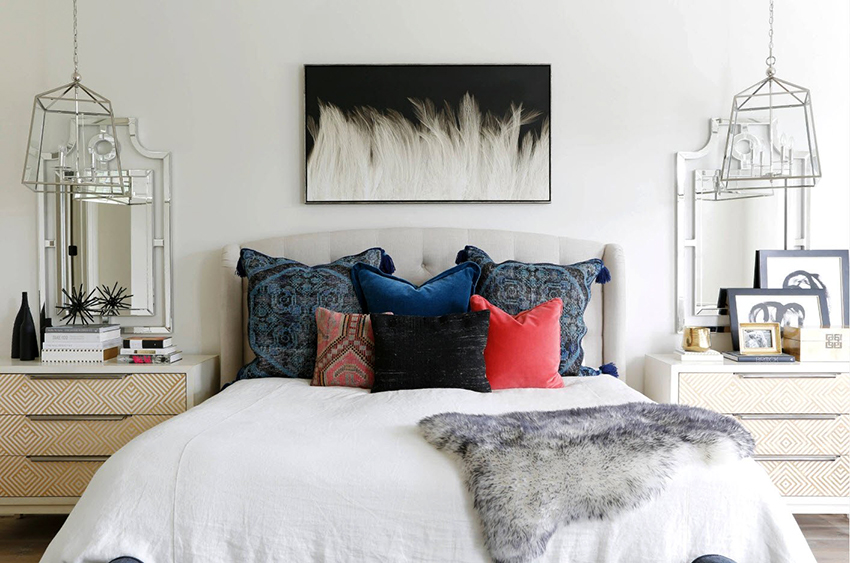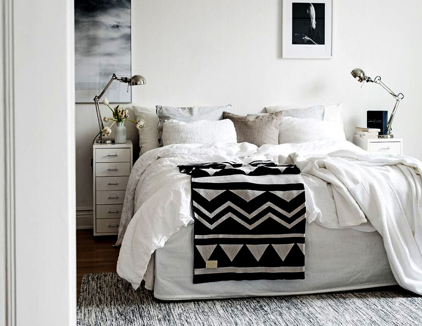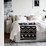 Kapaki-pakinabang na payo! Inirerekumenda ng mga taga-disenyo na kung pinalamutian mo ang panloob na silid-tulugan sa mga magaan na kulay, gumamit ng mayaman at maliliwanag na accent. Para sa mga layuning ito, ang magagandang unan o bed linen na pinalamutian ng isang hindi pangkaraniwang pag-print, pati na rin ang pandekorasyon na mga gizmos na gagawing kawili-wili at natatangi sa loob ng silid, ay perpekto.