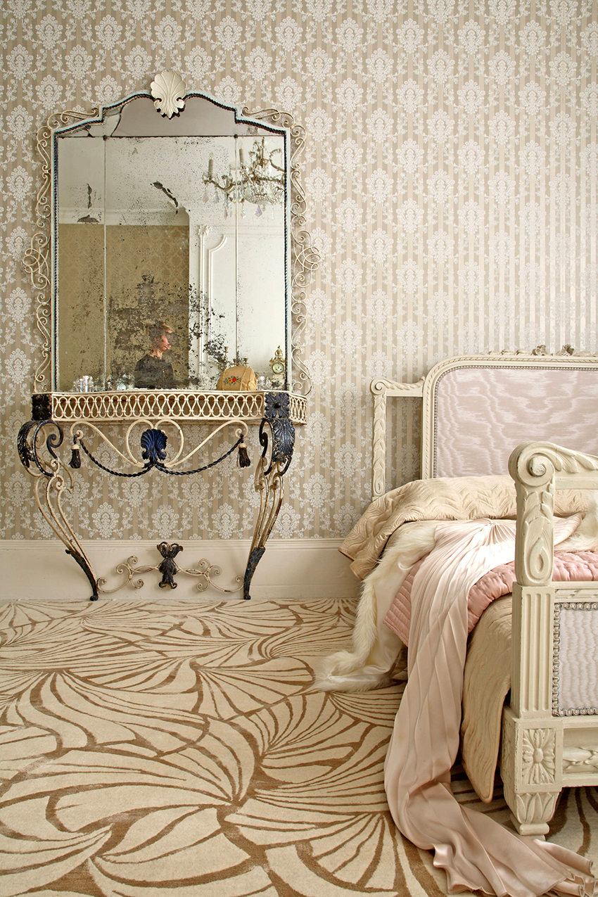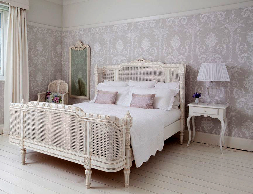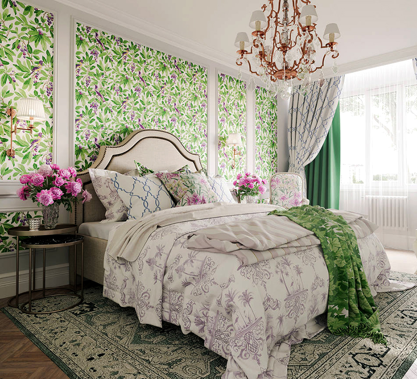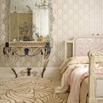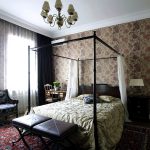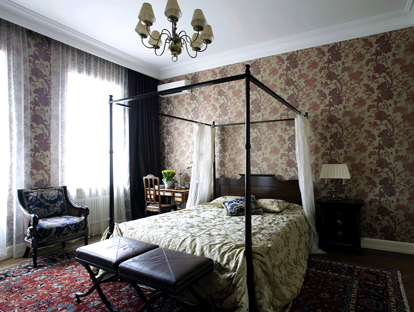 Ang isang mahusay na karagdagan sa klasikong panloob ay mga kurtina at wallpaper na may disenyo na naaayon sa estilo, pati na rin bed linen na pinalamutian ng isang naka-print.