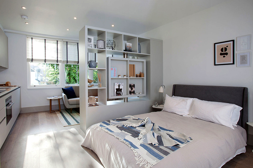Upang hatiin ang isang silid sa mga zone, maaari mong gamitin hindi lamang ang mga pagkahati, kundi pati na rin ang mga kabinet, racks, mesa. Pinapayagan na gumamit ng mga screen ng salamin na hindi labis na karga sa loob.