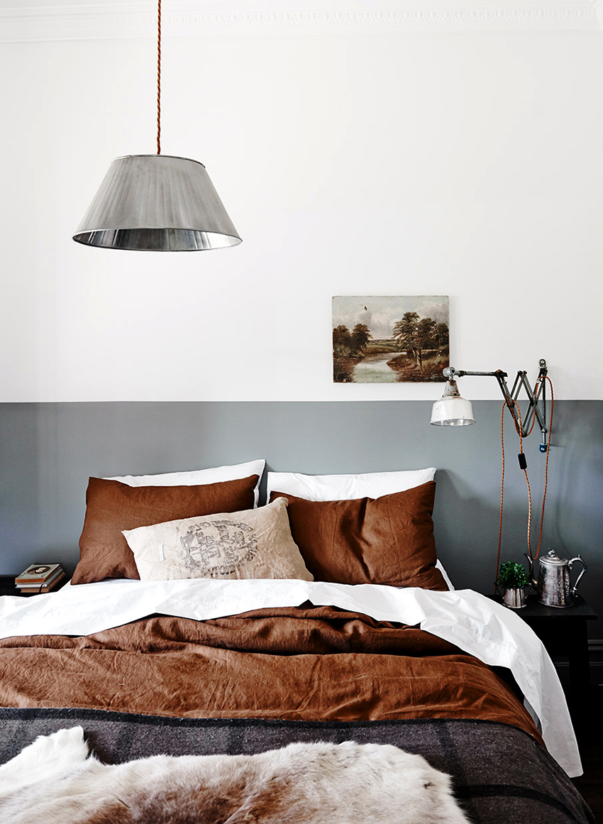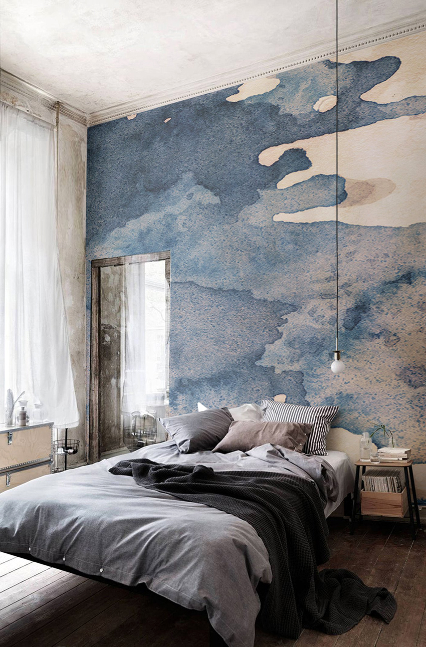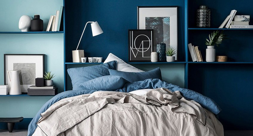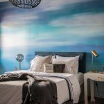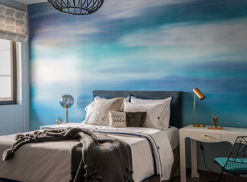 Gamit ang tinain, maaari kang lumikha ng isang orihinal na disenyo para sa isa o higit pang mga pader. Kadalasan, ang ibabaw sa likod headboard nakatayo mula sa iba pa. Upang gawin ito, ipininta ito sa isang magkakaibang kulay o pinalamutian ng isang pattern. Ang mga silid-tulugan na may dingding na pinalamutian ng gradient ay mukhang kawili-wili. Sa kasong ito, maraming mga shade ang ginagamit na maayos na dumadaloy mula sa isa't isa. Ang bilang ng mga posibleng pagkakaiba-iba ng disenyo ay praktikal na walang limitasyong.